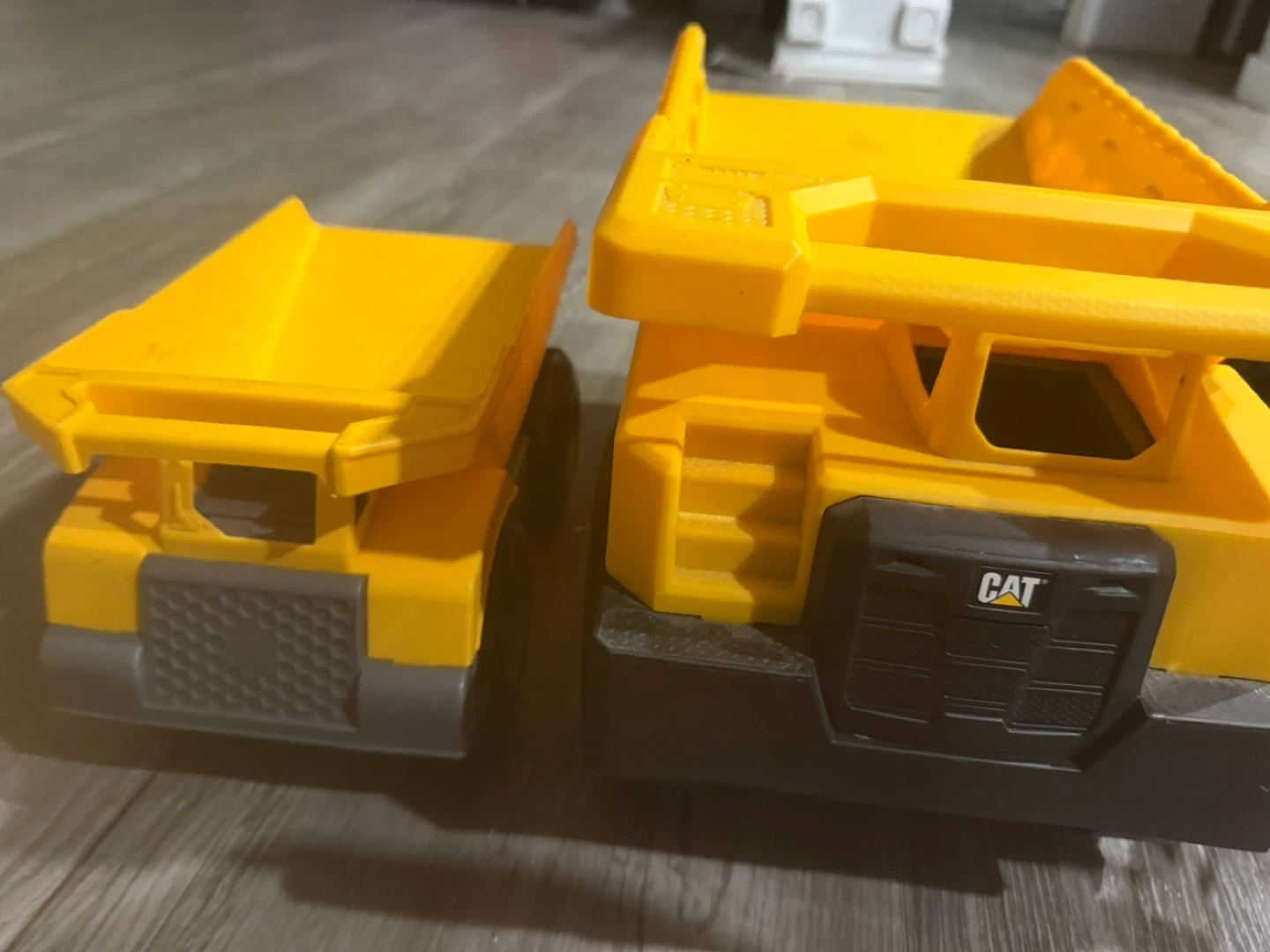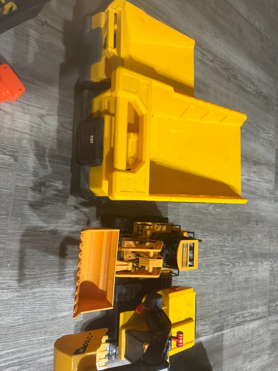 This bundle includes a Little Tikes tool set with various plastic tools like a level, pliers, and a drill, all in a yellow and black toolbox. Also features a CAT yellow dump truck toy with a movable bucket. Perfect for little construction enthusiasts!