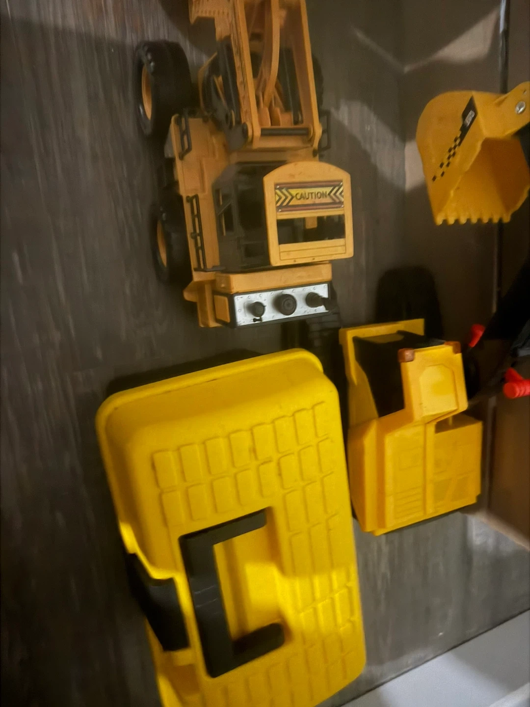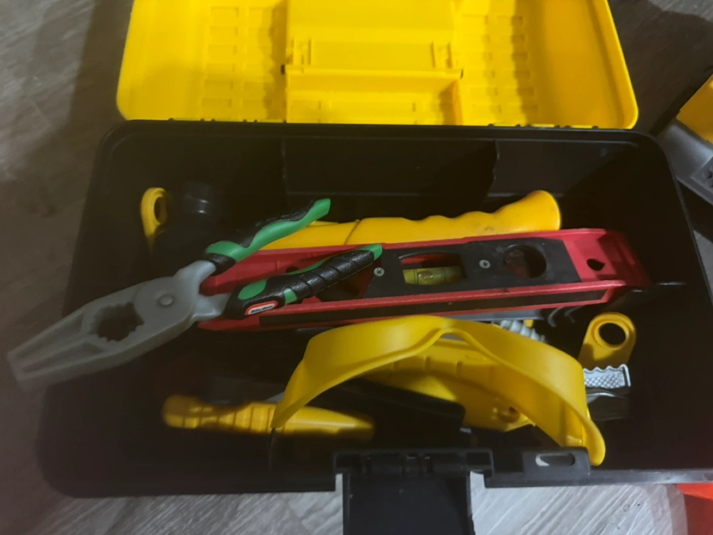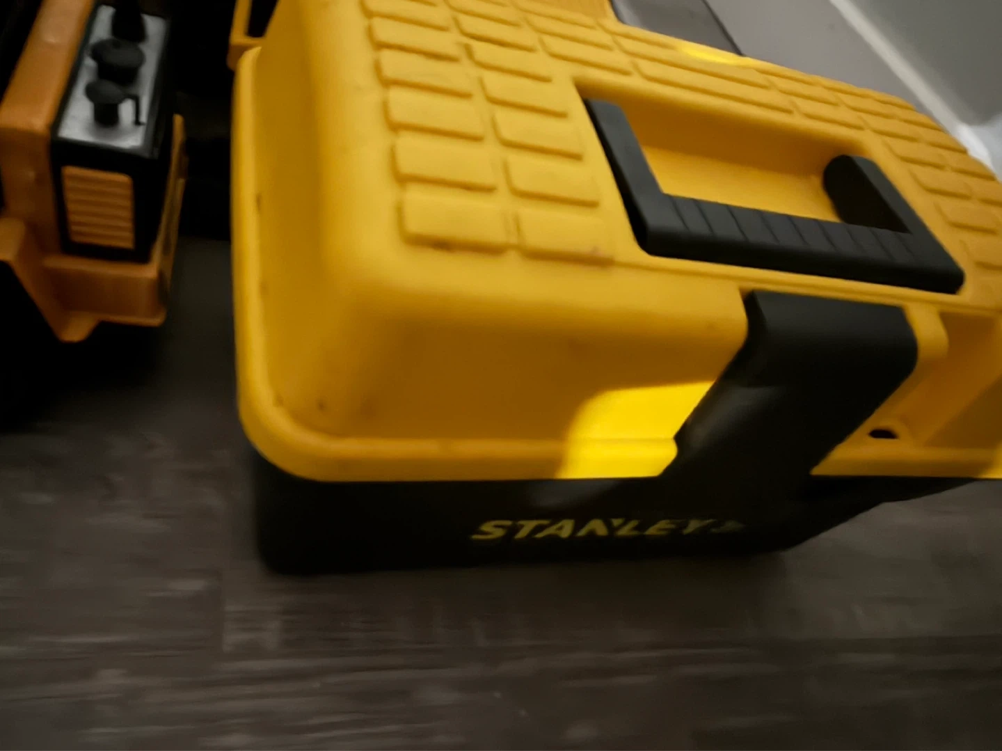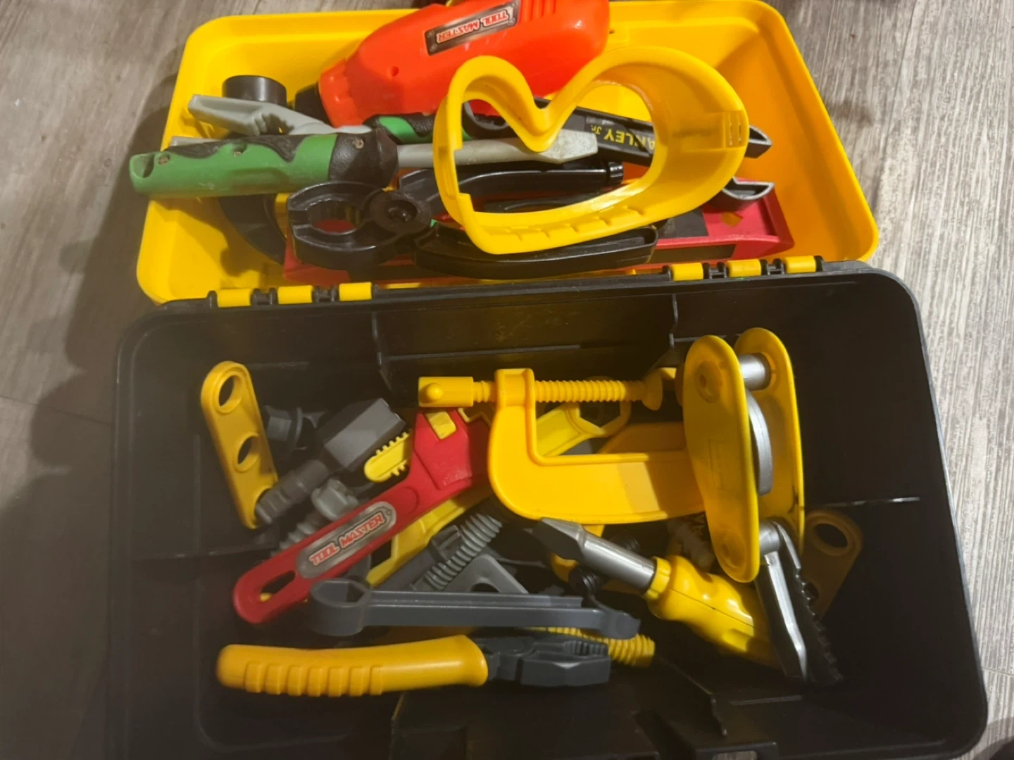 This bundle includes a Little Tikes tool set with various plastic tools like a level, pliers, and a drill, all in a yellow and black toolbox. Also features a CAT yellow dump truck toy with a movable bucket. Perfect for little construction enthusiasts!