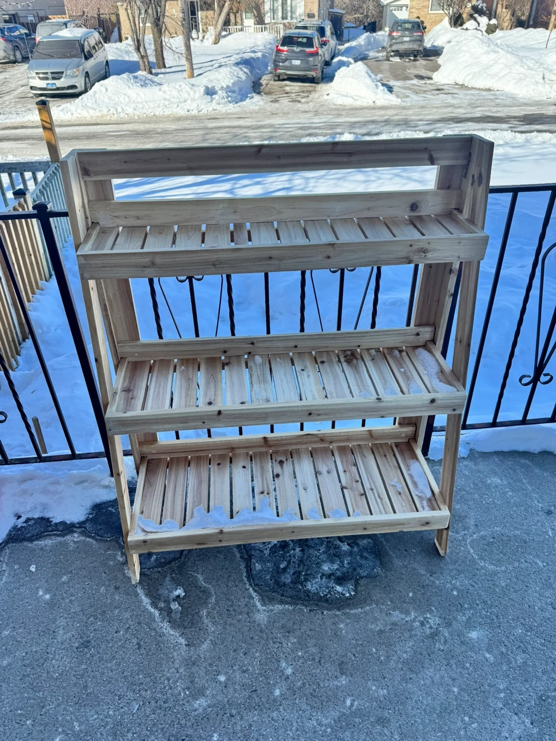 Three-tiered wooden plant stand. It's made of wood with a natural finish. The overall height is 42 inches. The base measures 32 inches wide. Delivery available with extra cost
