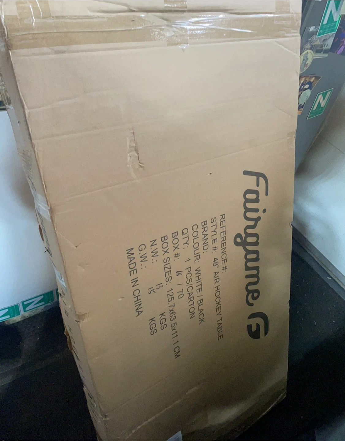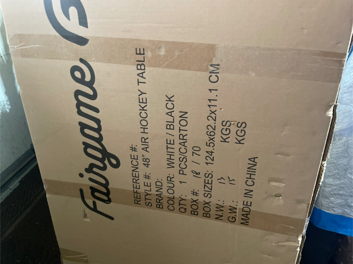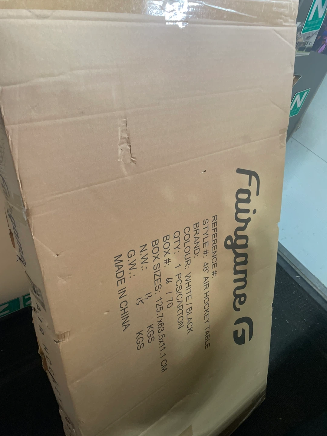 Brand new Fairgame 48" air hockey table in white and black. Box dimensions are 124.5x62.2x11.1 CM. This table is still in its original packaging.