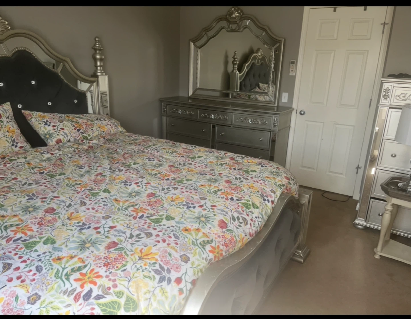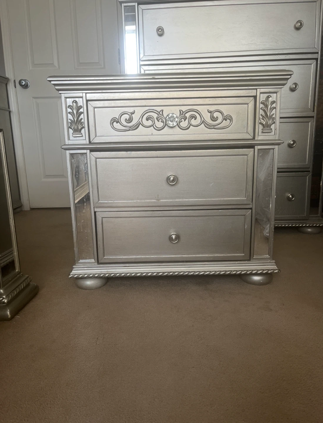 A stylish silver bedroom set with mirrored accents , includes 2 night stands, dresser with mirror, talk dresser , king bed frame . Does not include mattress