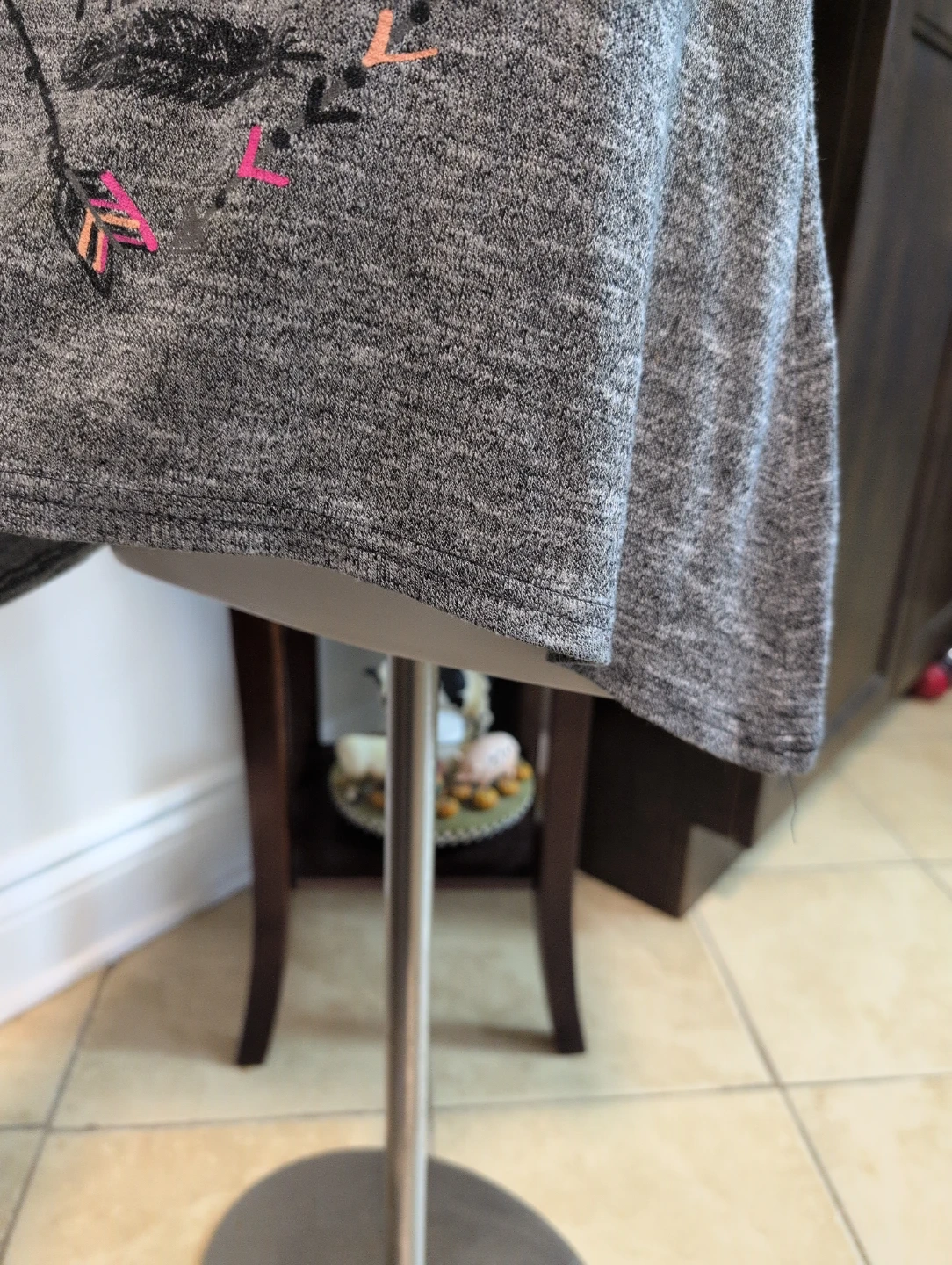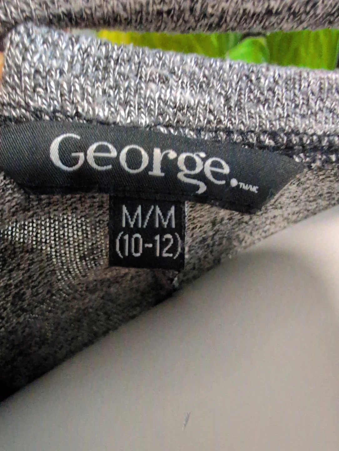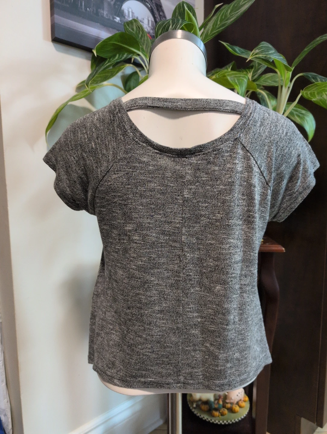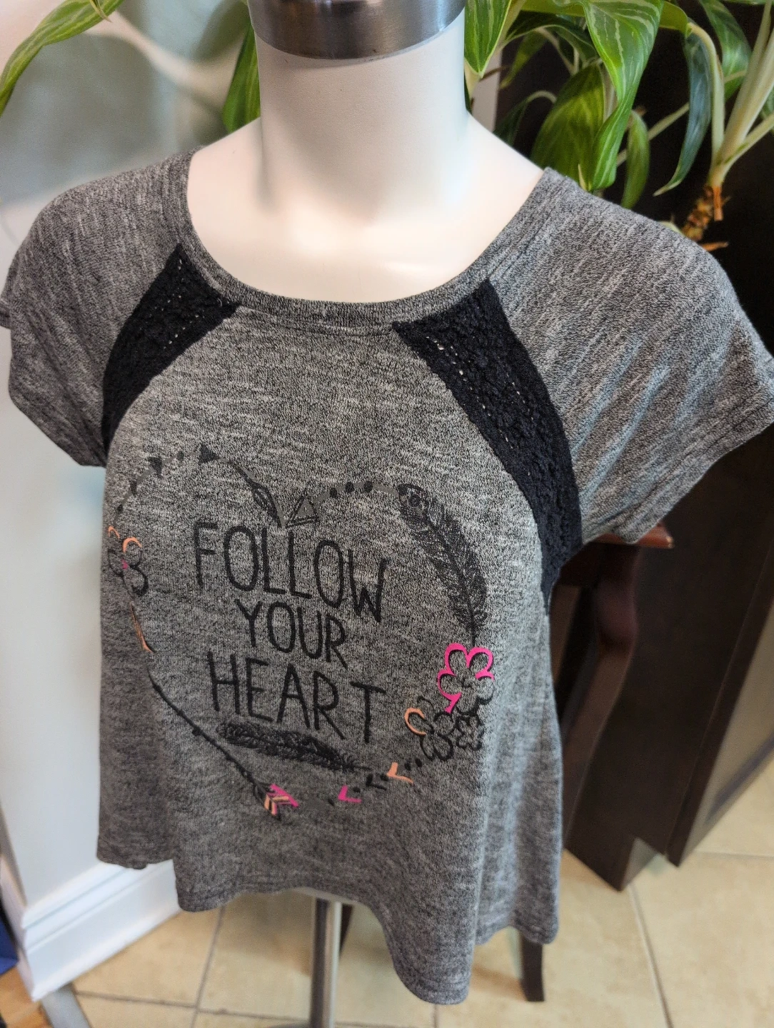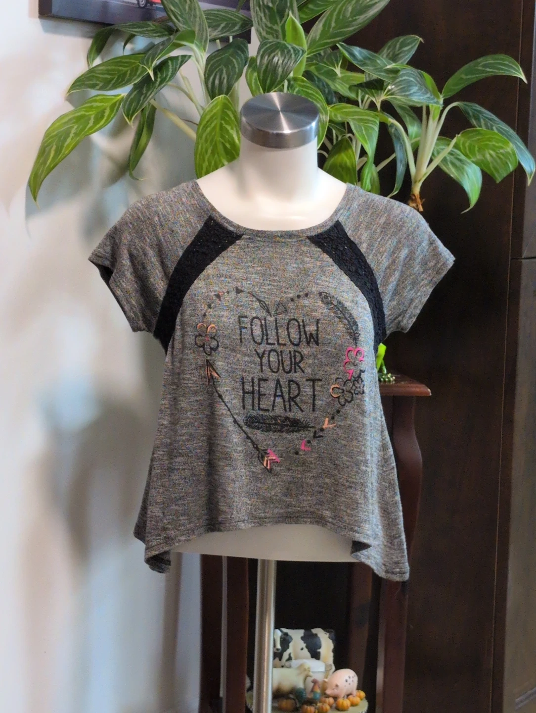 This George t-shirt is grey and features a "Follow Your Heart" graphic design. It has lace accents on the shoulders and a cutout detail on the back. Size is M/M (10-12).