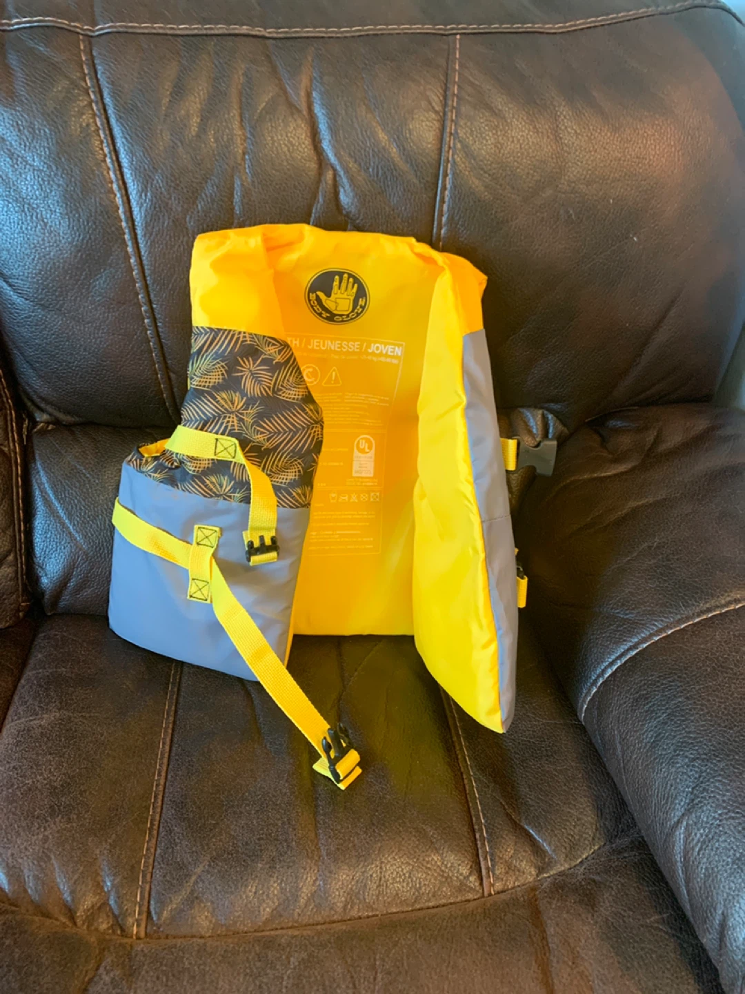 Youth life jacket by Body Glove! It's in great condition and ready for some fun in the water. The colours are yellow, grey, and black with a palm leaf pattern.