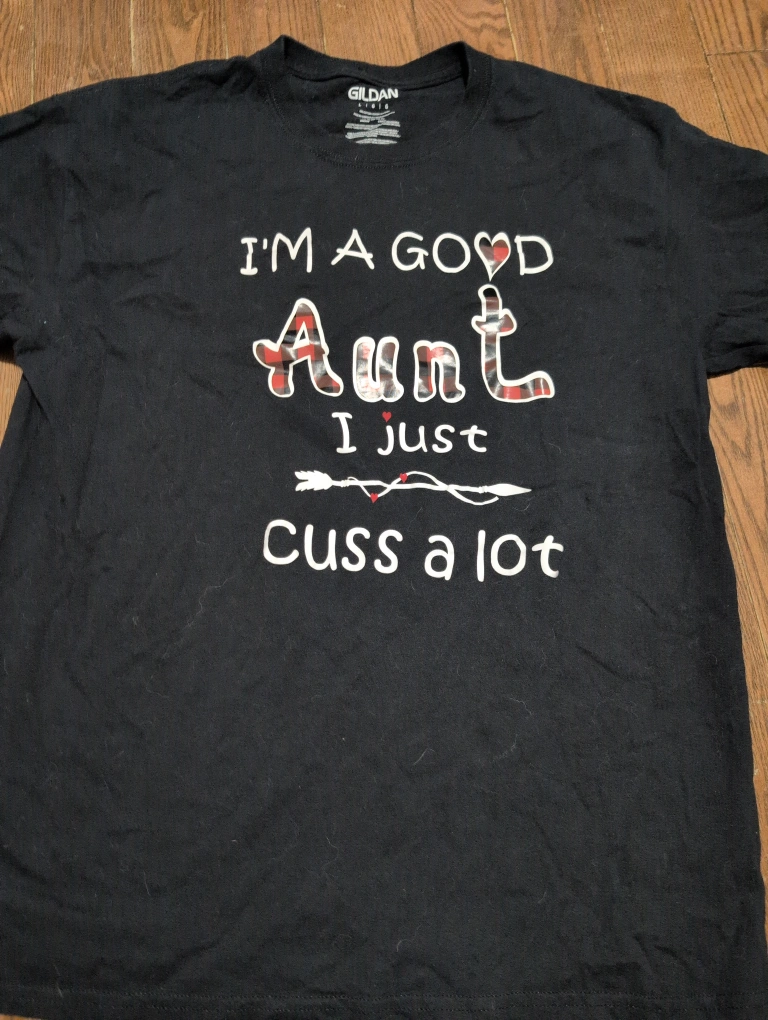 60Black Gildan t-shirt with a fun graphic! It says 'I'm a good Aunt I just cuss a lot'. size LG never worn $5 OBO