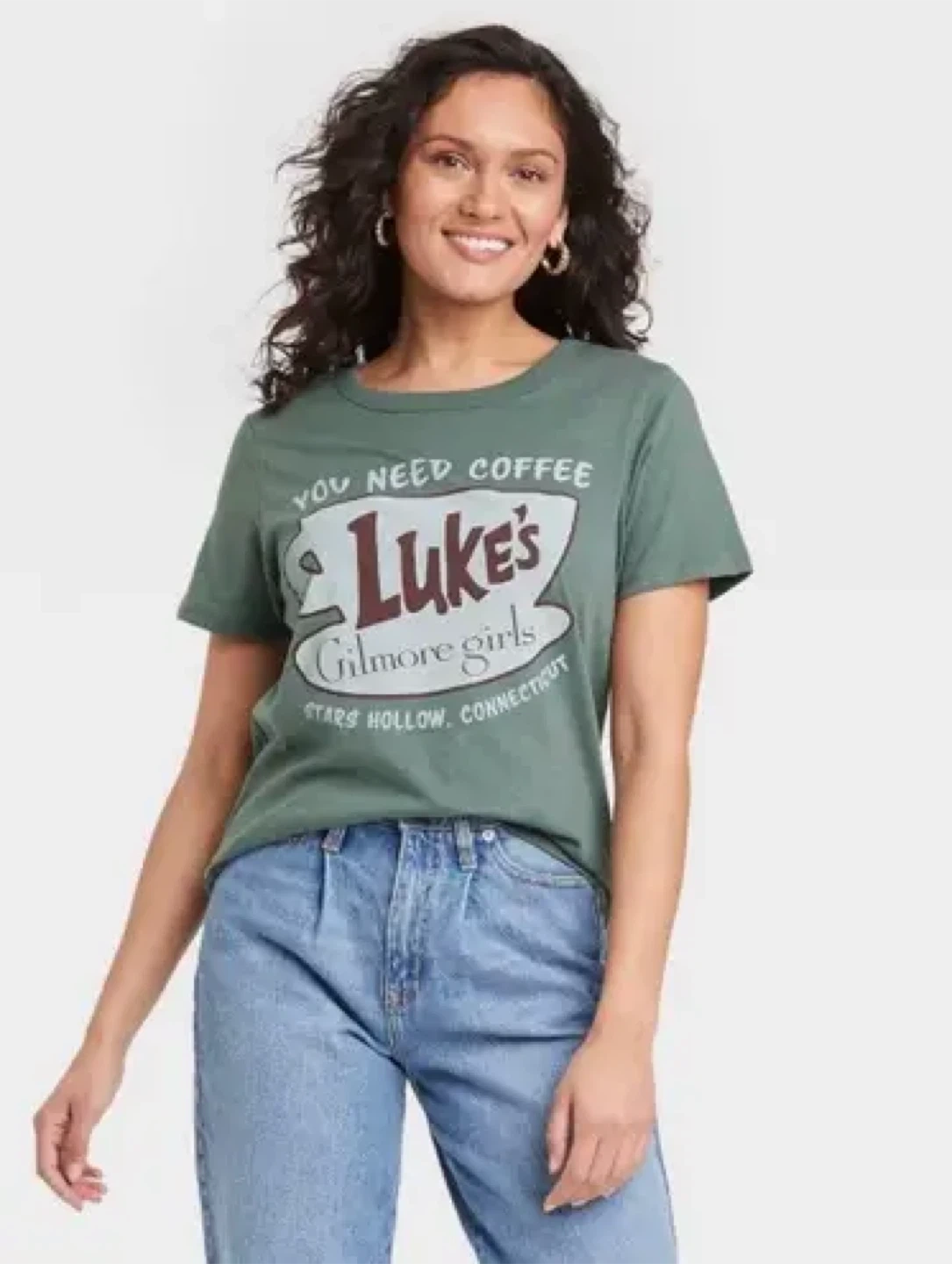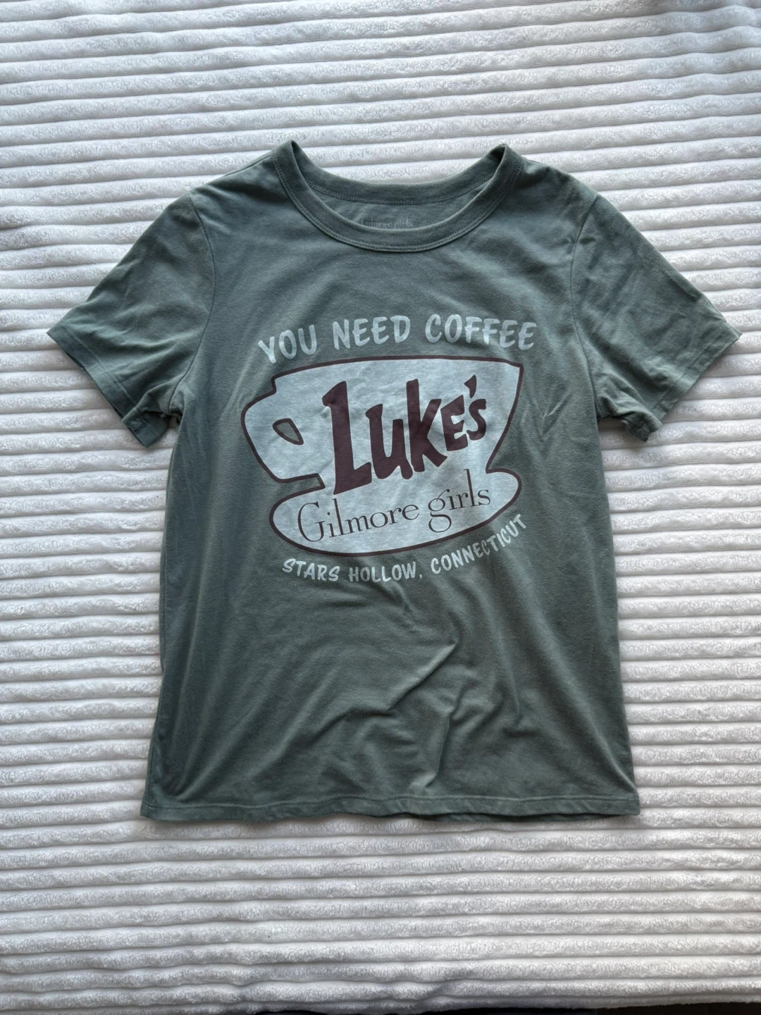 41Selling a cute Gilmore Girls t-shirt featuring Luke's Diner! The shirt is a soft, muted green and is a size small. The material is 60% cotton and 40% polyester.