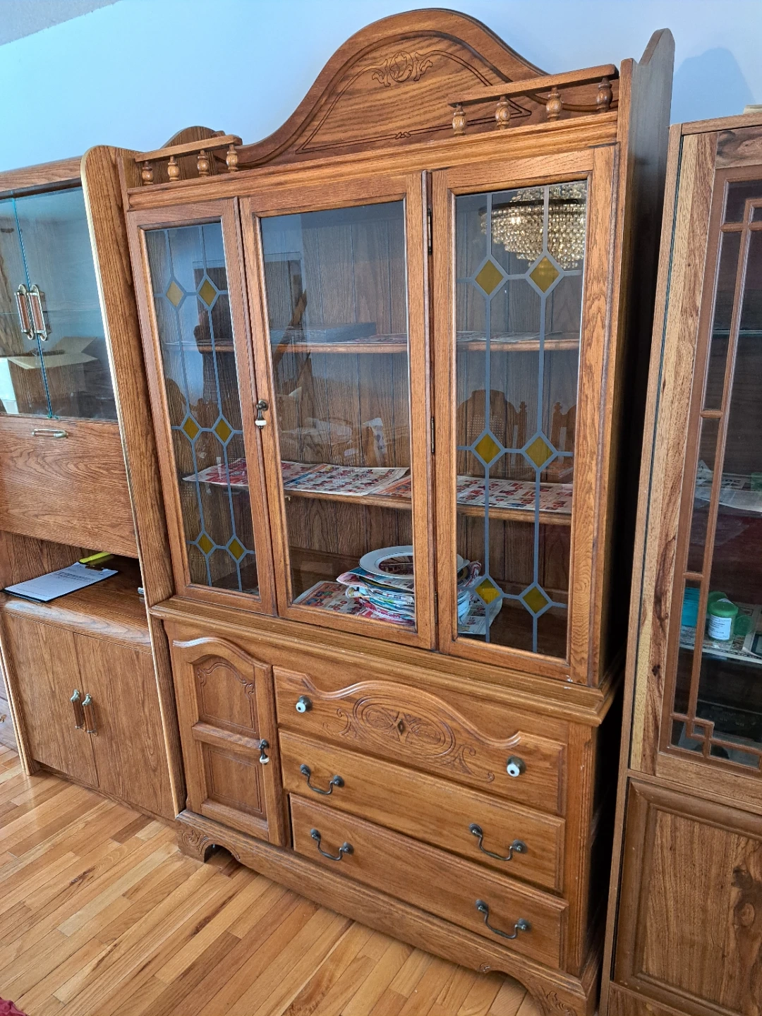 - Features: Glass display doors, stained/decorative glass panels, multiple shelves, drawers, lower cabinet doors, built-in lighting