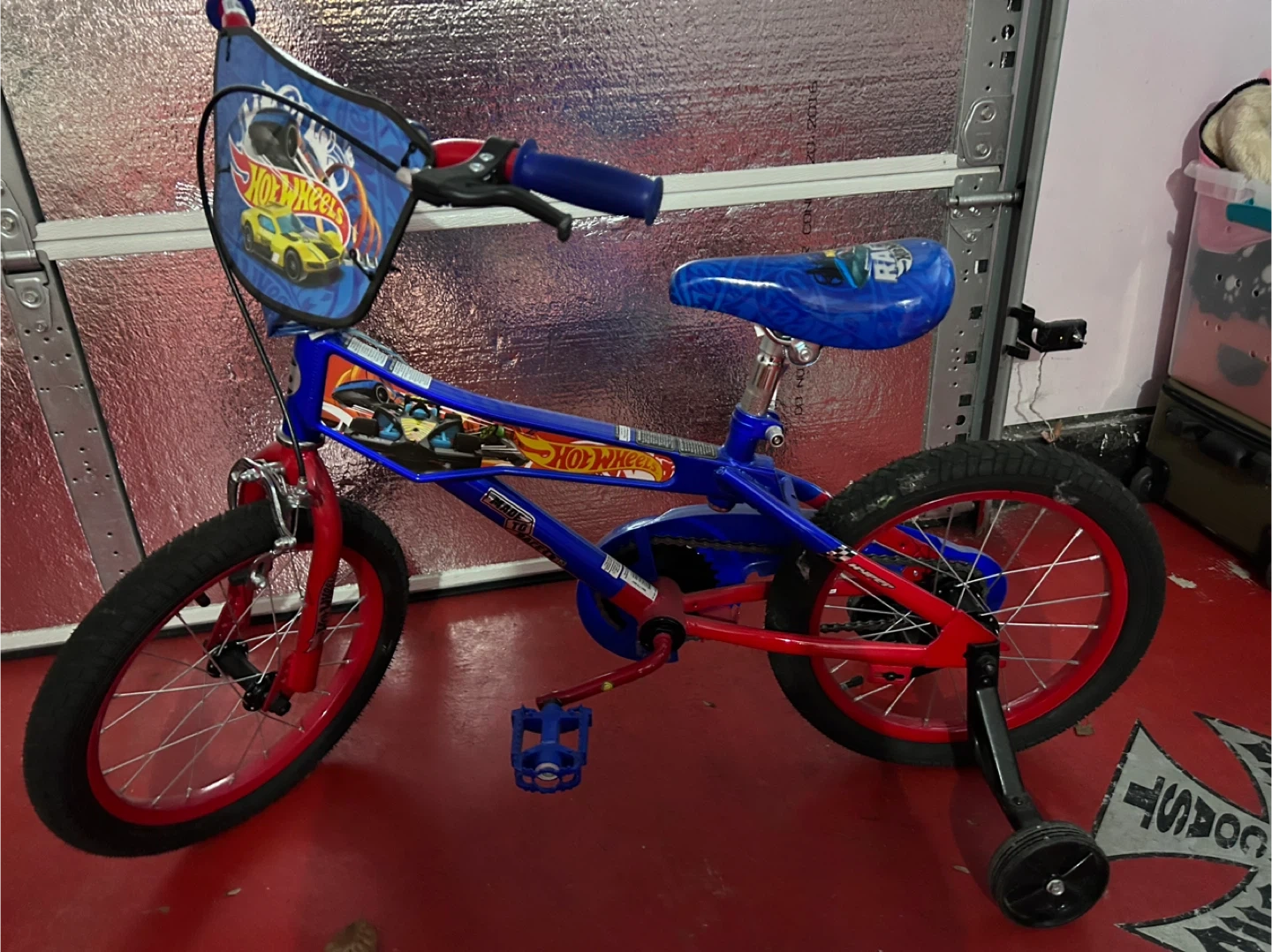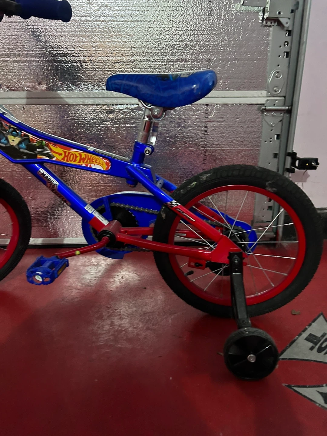 This Hot Wheels bike is blue and red. It comes with training wheels. This would be great for a young rider starting out!