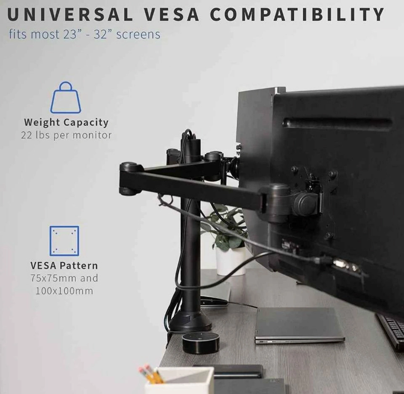 Fits 23" To 32" Screens - This mount holds 3 monitors ranging from 23” to 32” in size with VESA 75x75mm and 100x100mm backside mounting holes. All steel construction supports 10kg per screen (30kg total)
