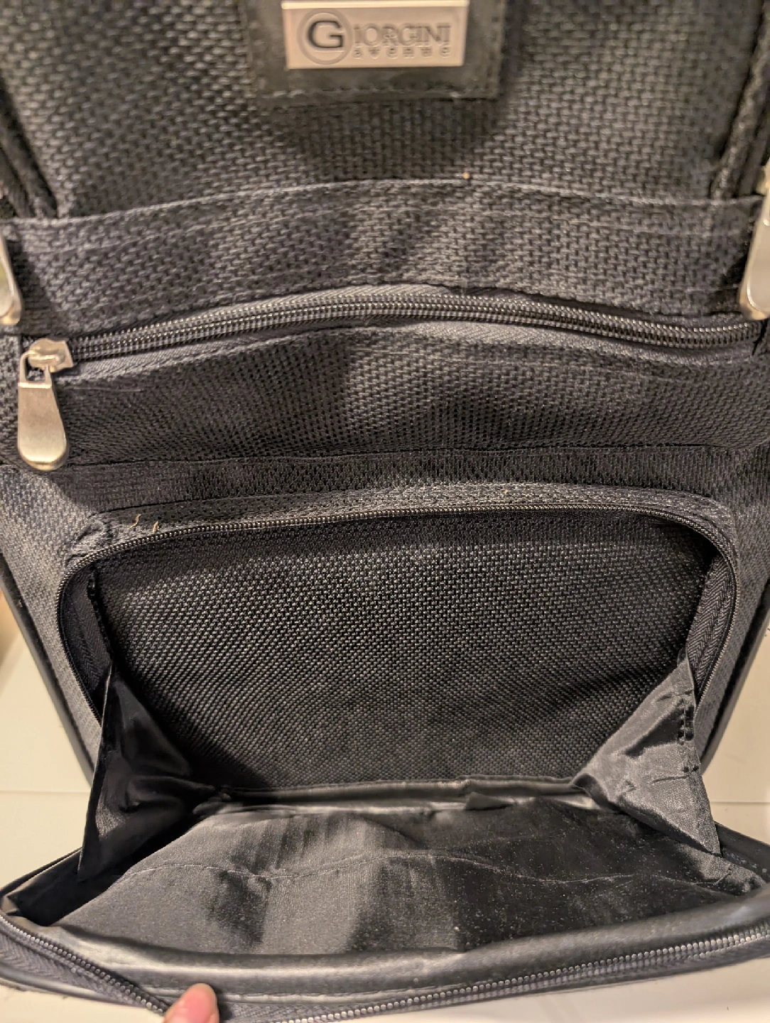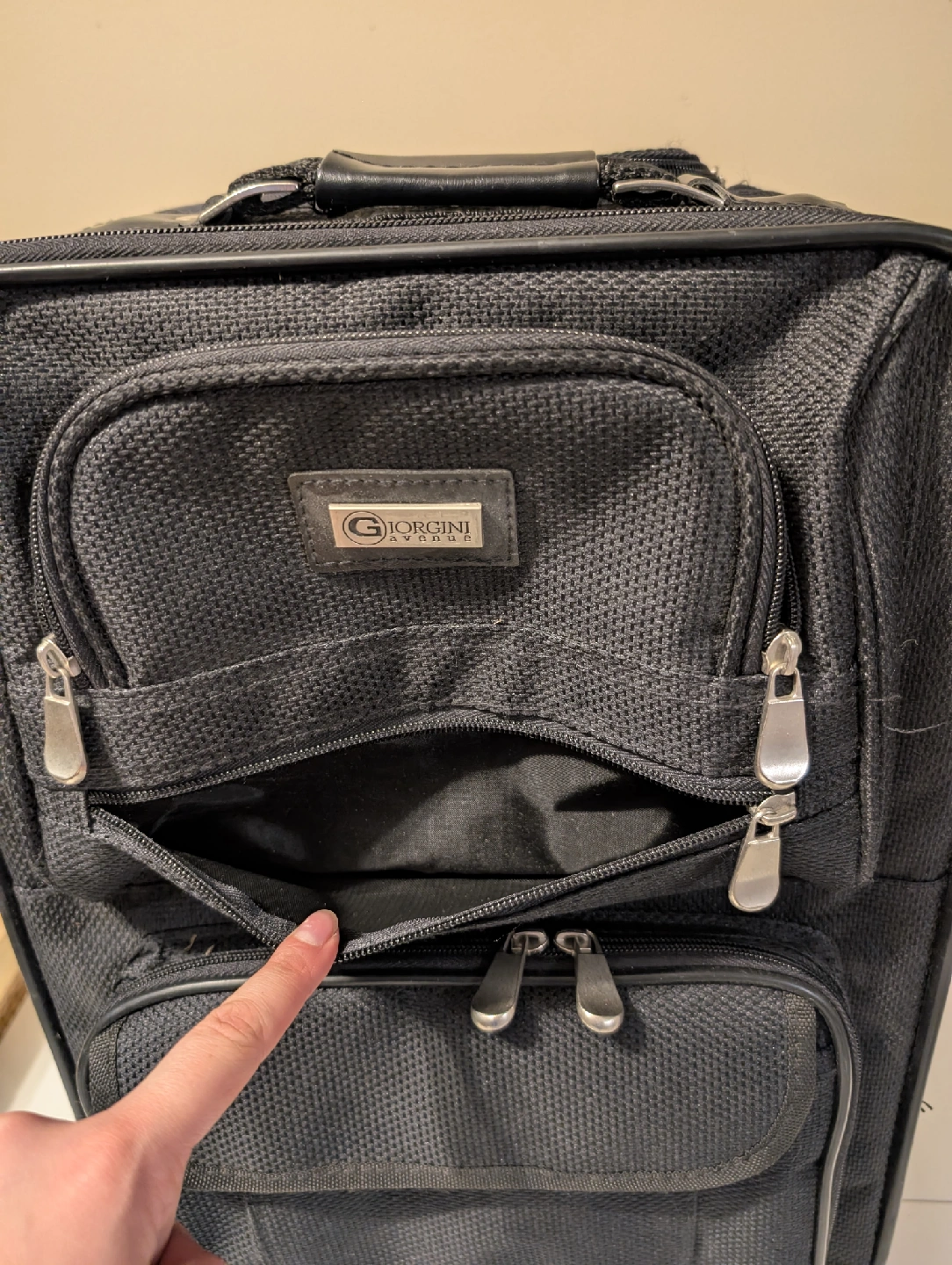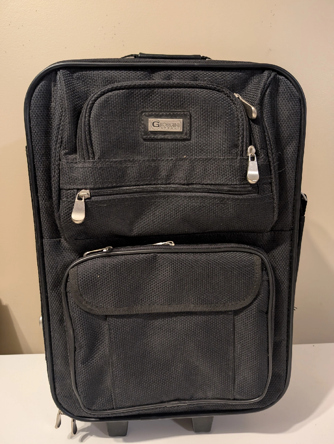 Selling a gently used Giorgini carry-on luggage in black. It features multiple compartments for organized packing. Perfect for short trips or as an additional bag for longer travels. The retractable handle and wheels make it easy to maneuver through airports and hotels