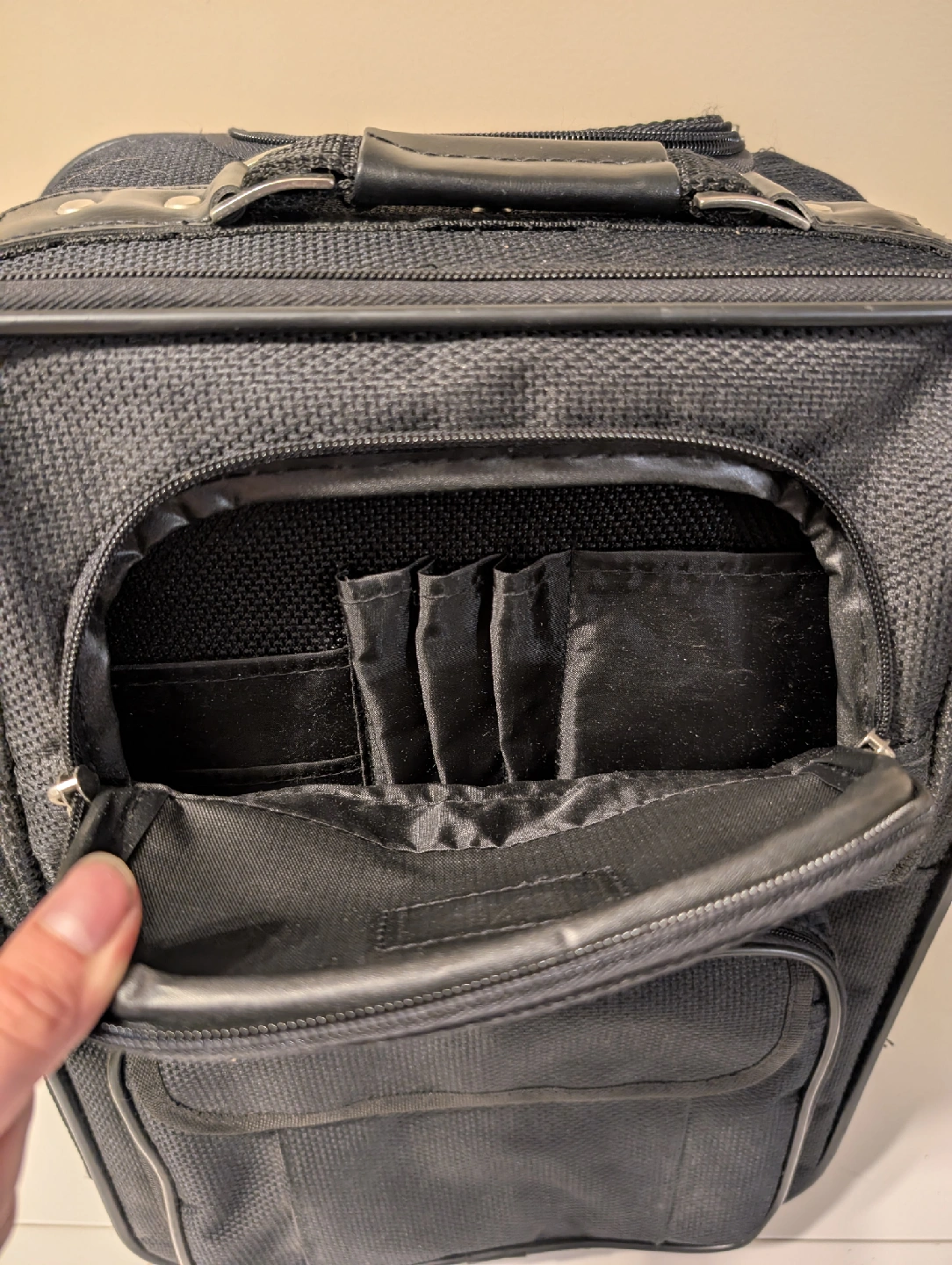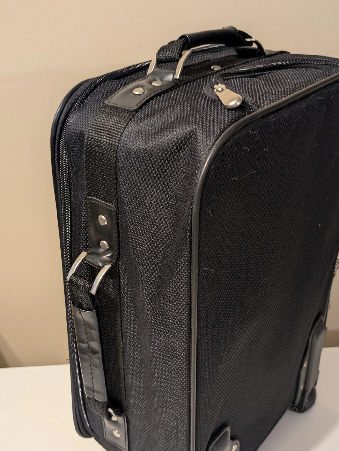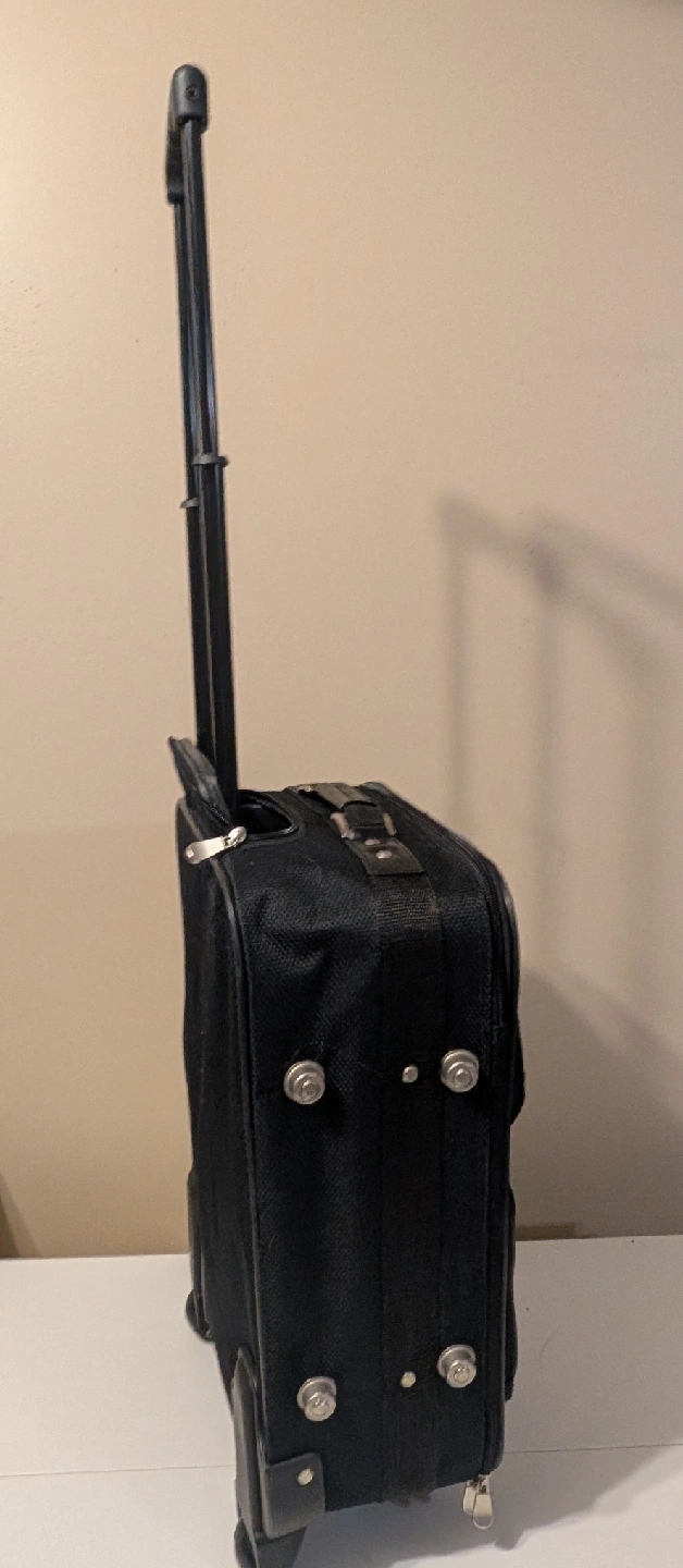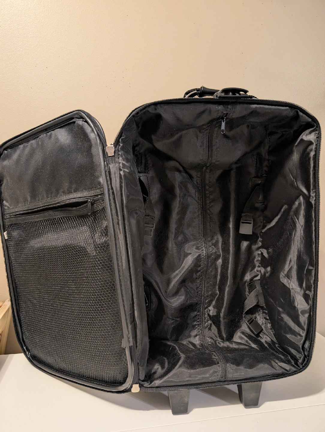 Selling a gently used Giorgini carry-on luggage in black. It features multiple compartments for organized packing. Perfect for short trips or as an additional bag for longer travels. The retractable handle and wheels make it easy to maneuver through airports and hotels