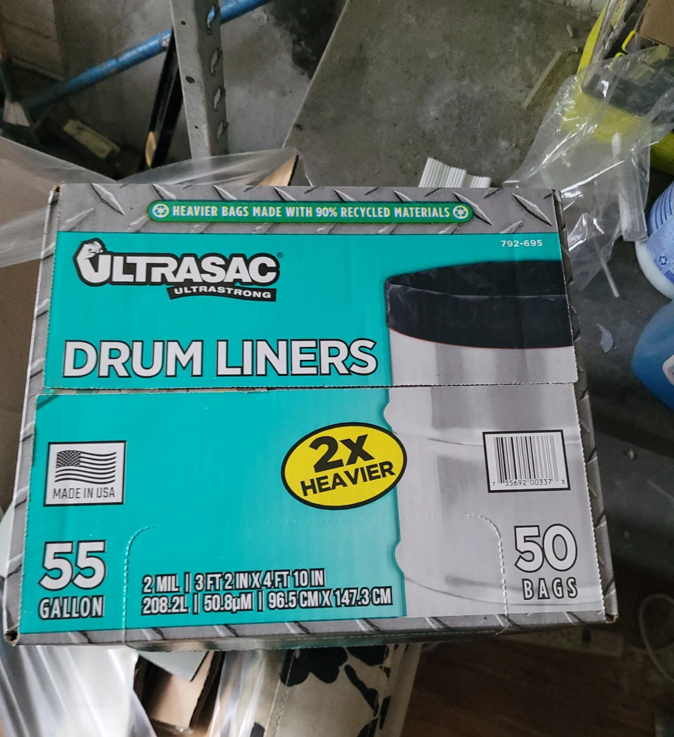 ULTRASAC drum liners are 2x heavier and made with 90% recycled materials. Each bag measures 3 ft 2 in x 4 ft 10 in. The box contains 50 bags.