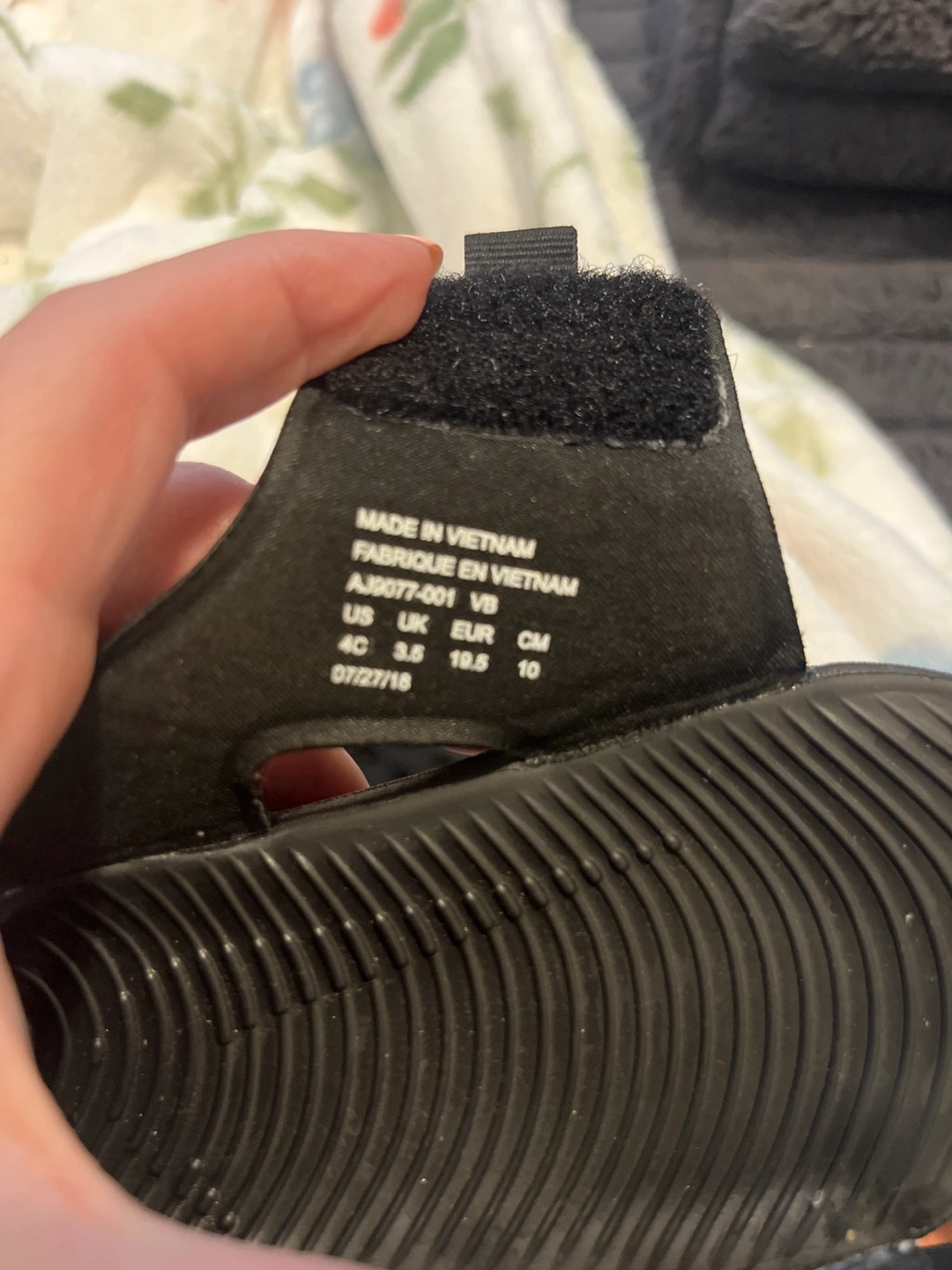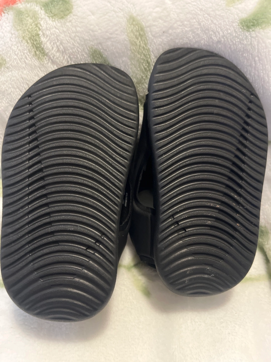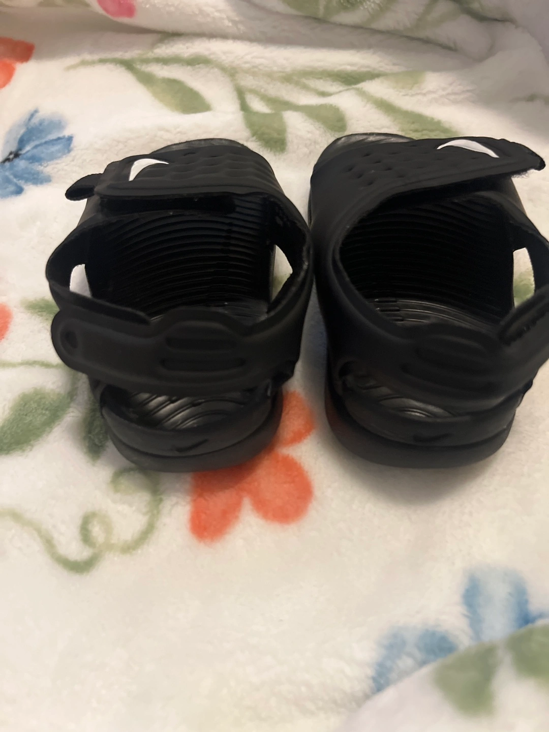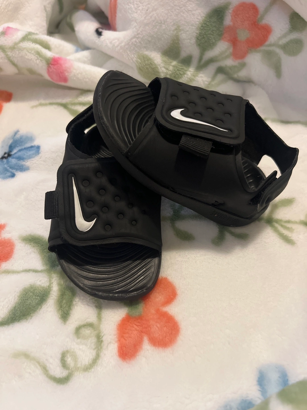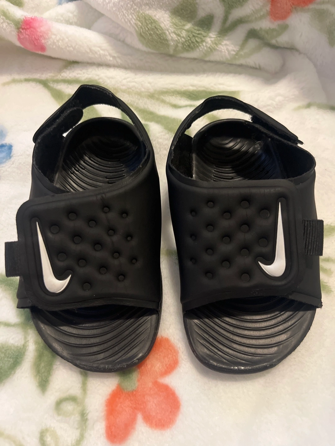 Toddler Nike sandals in size 4C. They are black with the white Nike swoosh logo. Great for the pool or beach!