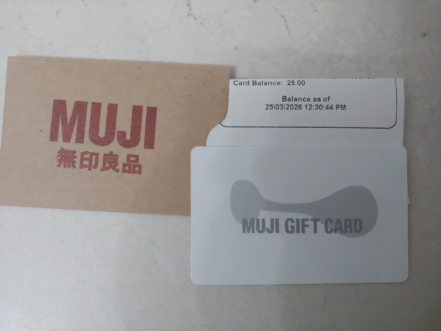 Muji gift card with a balance of $25.00. Balance as of March 25, 2026. can check balance on website during meet up.