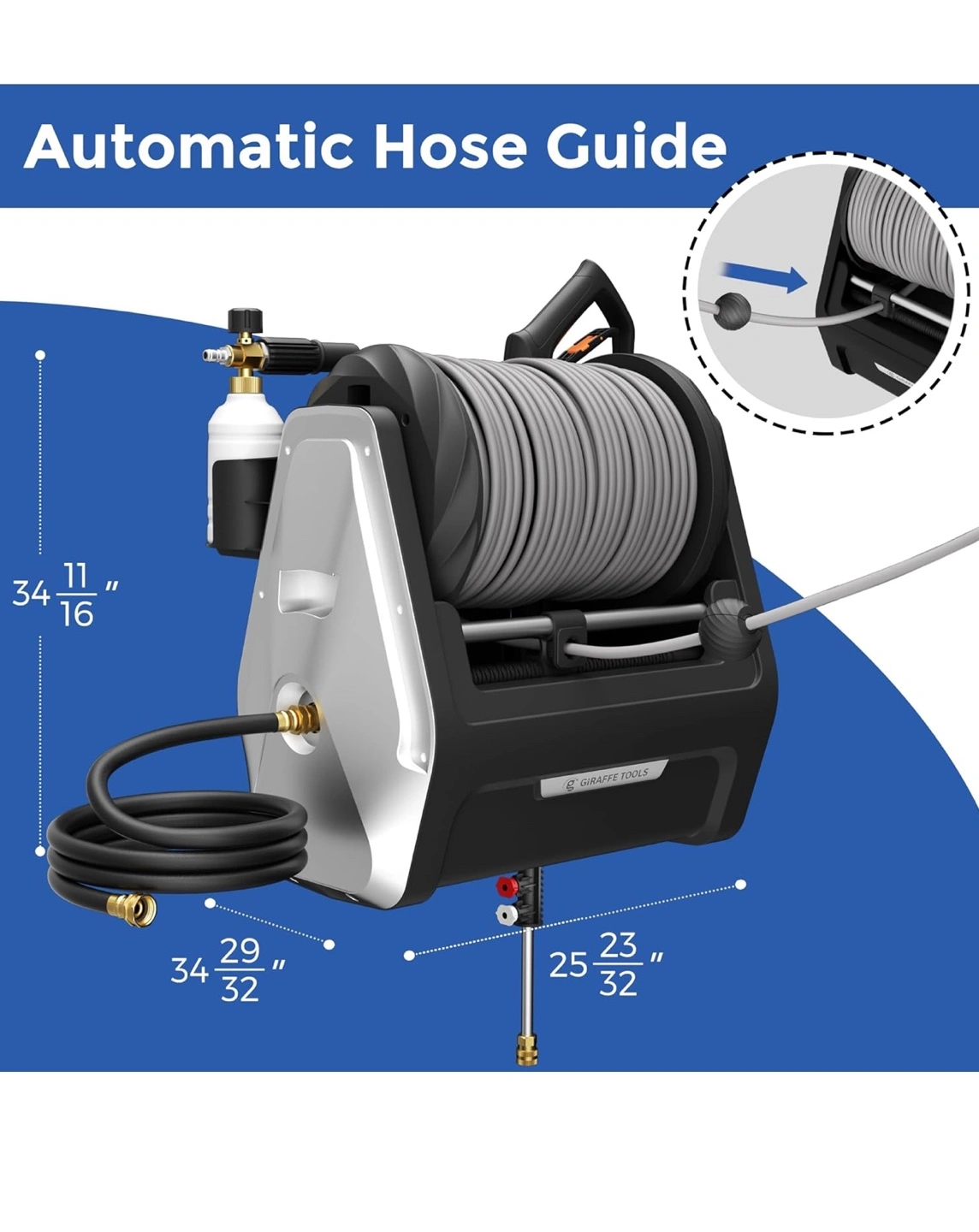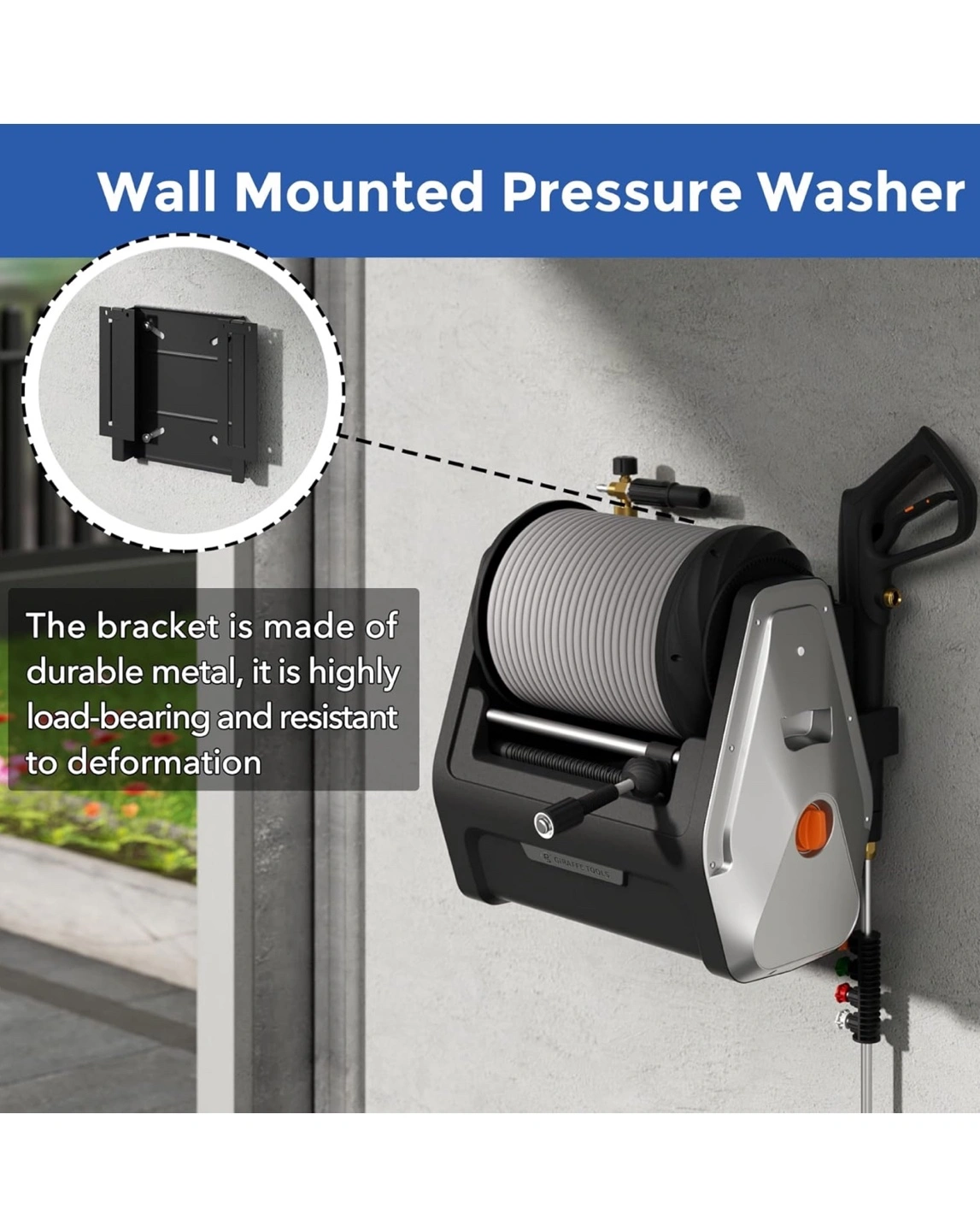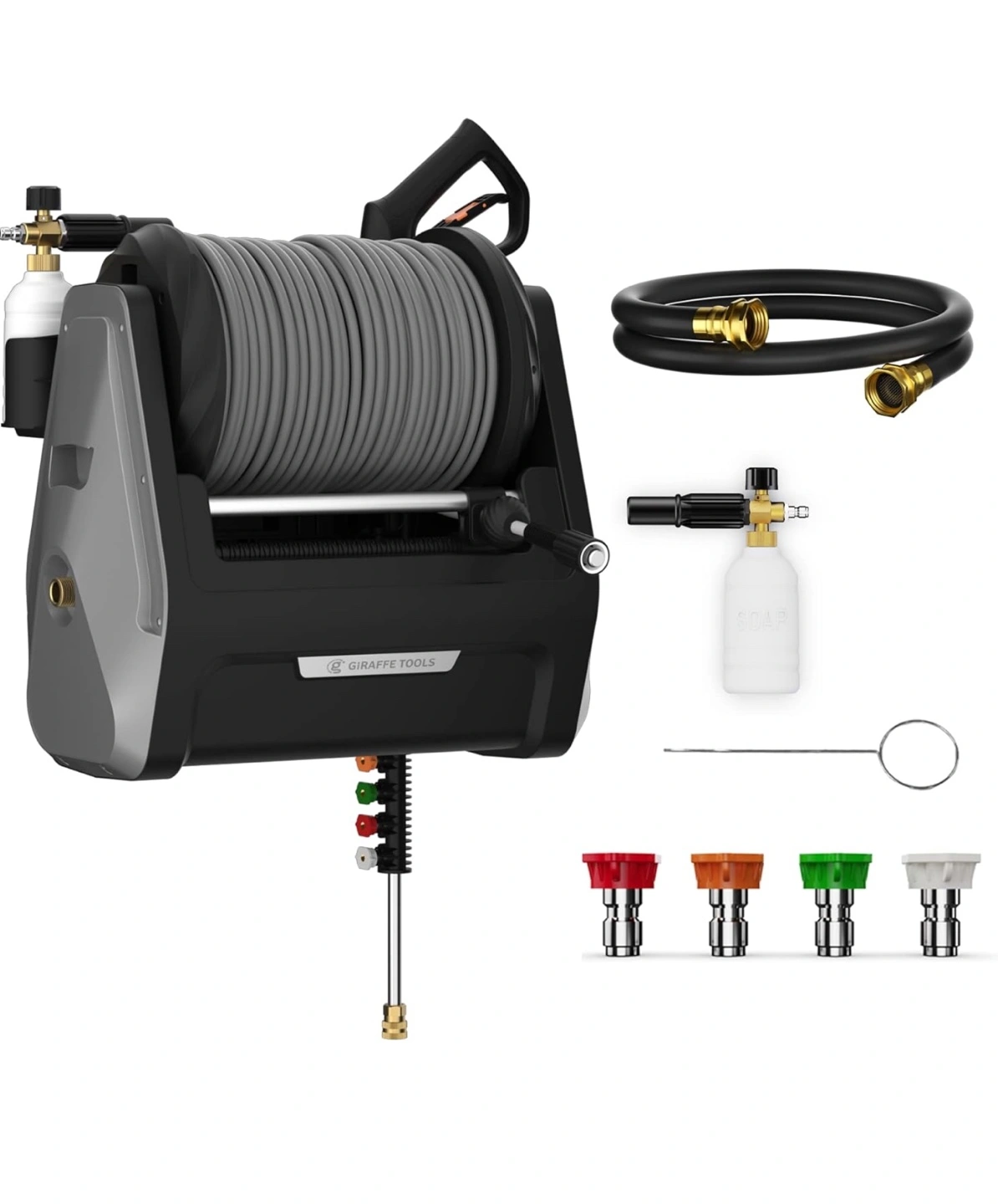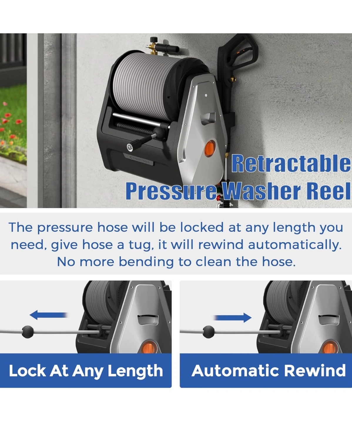 71Wall mounted pressure washer reel, locks at any length, automatic rewind, water resistant, includes a spray gun, 4 nozzles and 2 hoses.