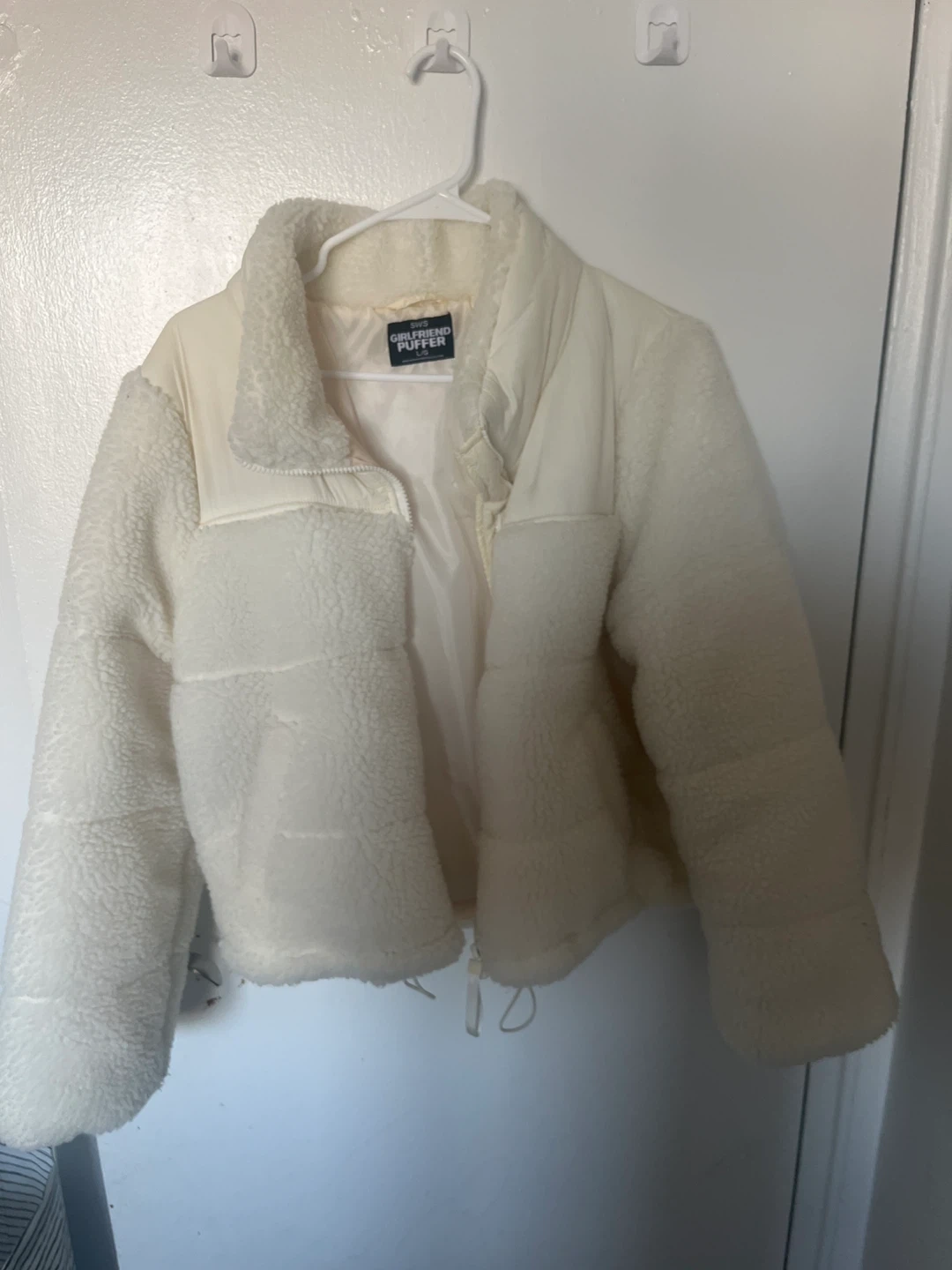 Selling a cozy Girlfriend Puffer jacket in a lovely cream colour. It's in great condition and perfect for keeping warm on chilly days! The jacket features a combination of soft, fluffy material and smooth panels, giving it a unique and stylish look