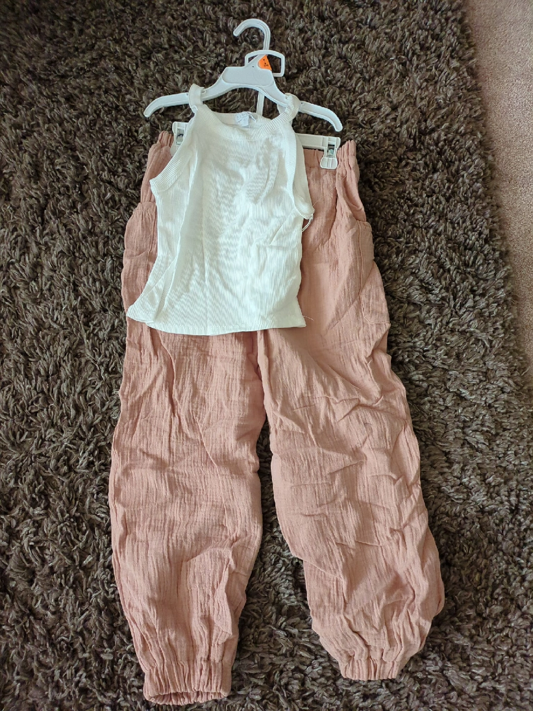 32Cute girl's two-piece outfit! Includes a white ribbed tank top and light pink pants. Perfect for summer or casual wear. The material looks lightweight and comfy! size X's, small, medium. buy group 6 get 1 free