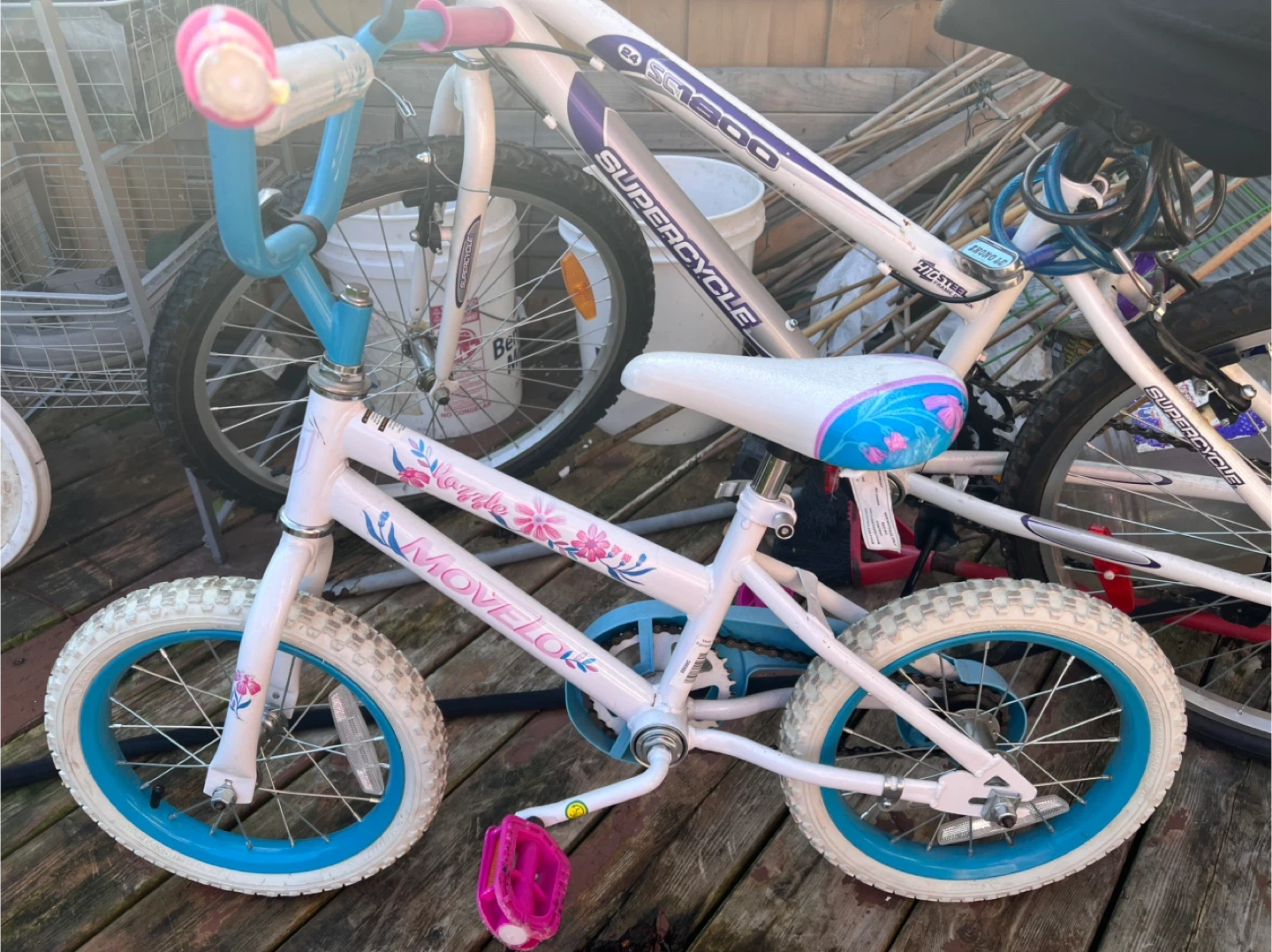 Cute Move Flow Dazzle girls' bike with a white frame and colourful floral details! Perfect for little ones learning to ride. The tires are in great shape and it has a comfortable seat