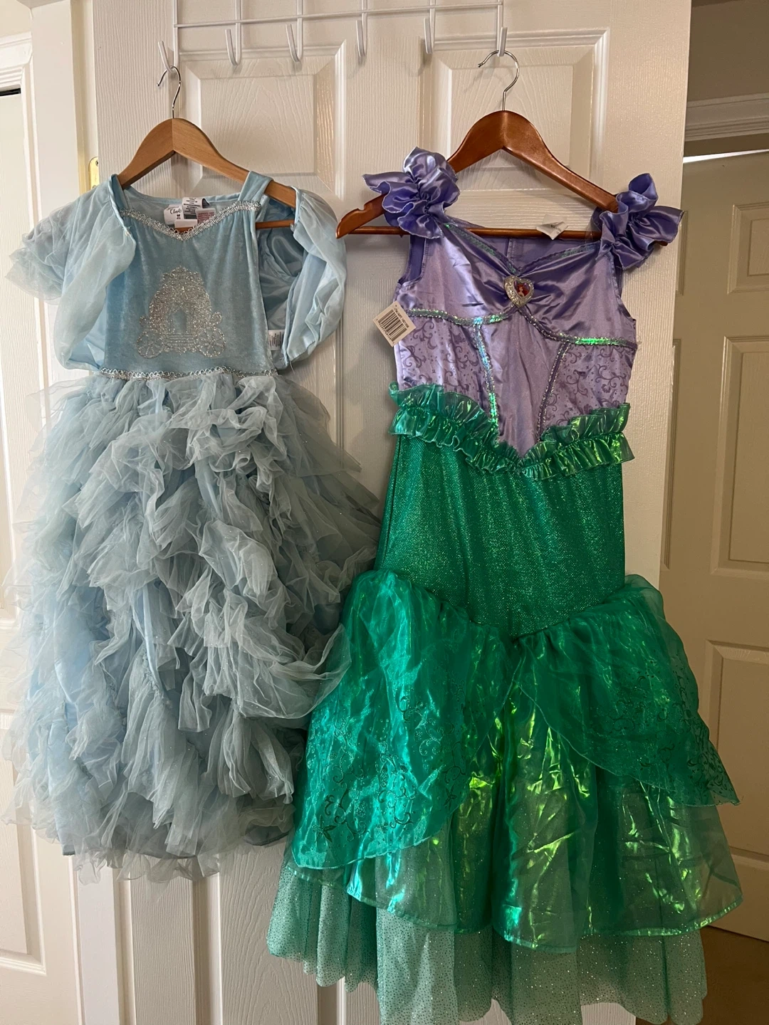 2 new, good quality dress-up costumes for your little one! One is a Cinderella-inspired blue dress size 6/7 and the other is an Ariel-inspired Little Mermaid dress size 7/8. Perfect for dress up or Halloween. $15 each or both for $25