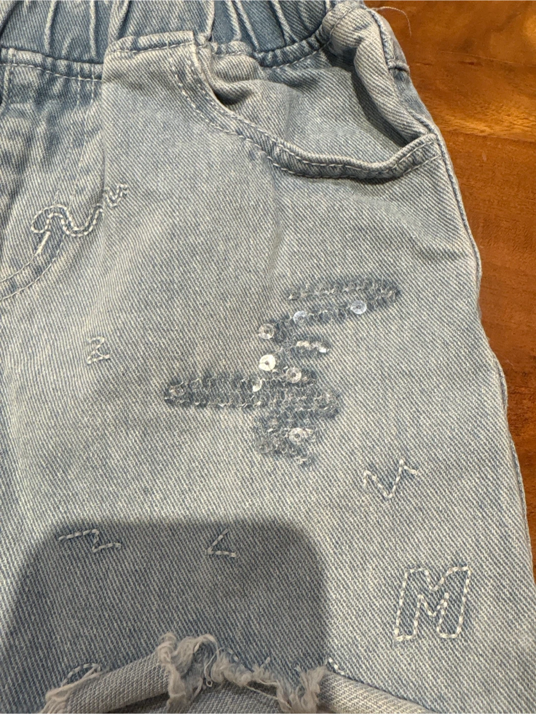 20Cute pair of denim shorts for girls! They have an elastic waistband and fun embroidered details. The size is 140cm (tall)and the material is 92.2% cotton, 5.3% viscose fiber, and 2.5% other fiber