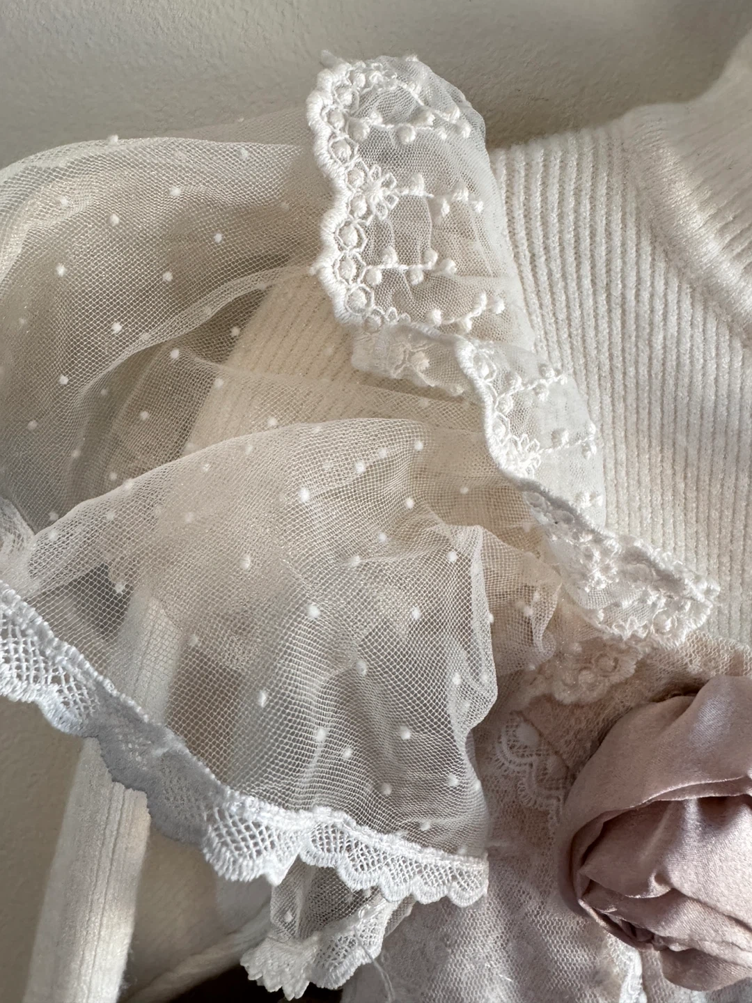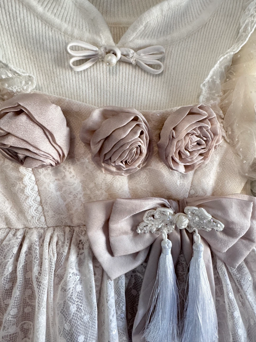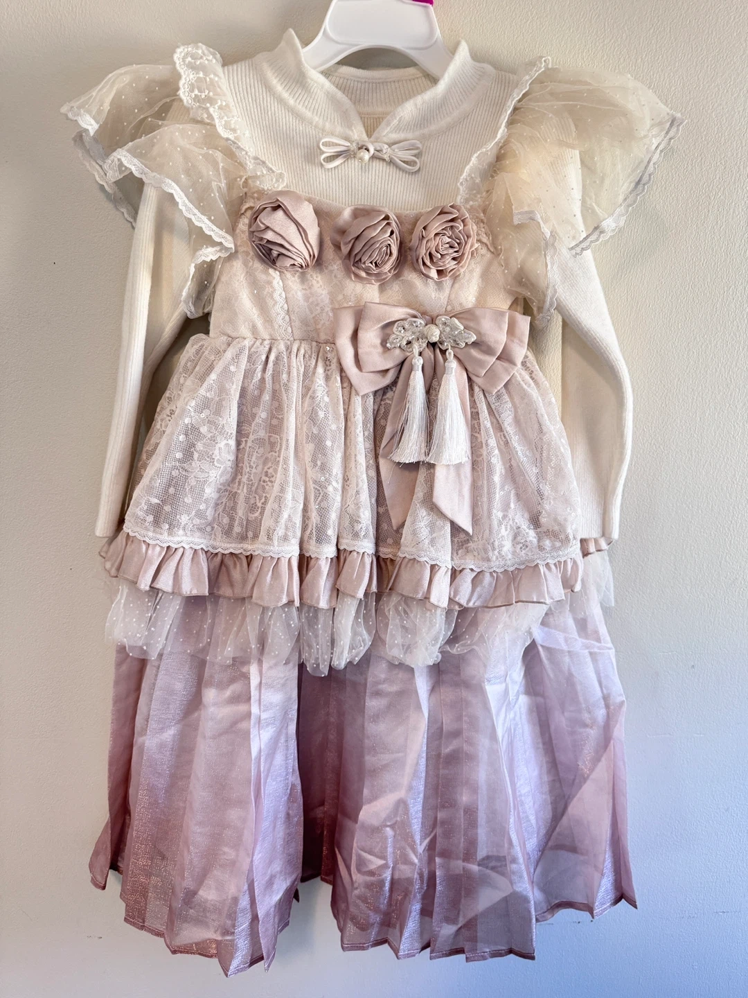 18This adorable girl's dress features a white knit top with long sleeves and a layered pink skirt with lace and ribbon details. It's perfect for Xmas gift!