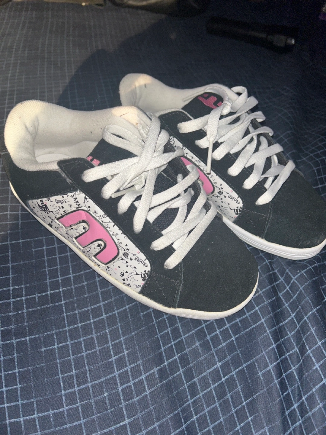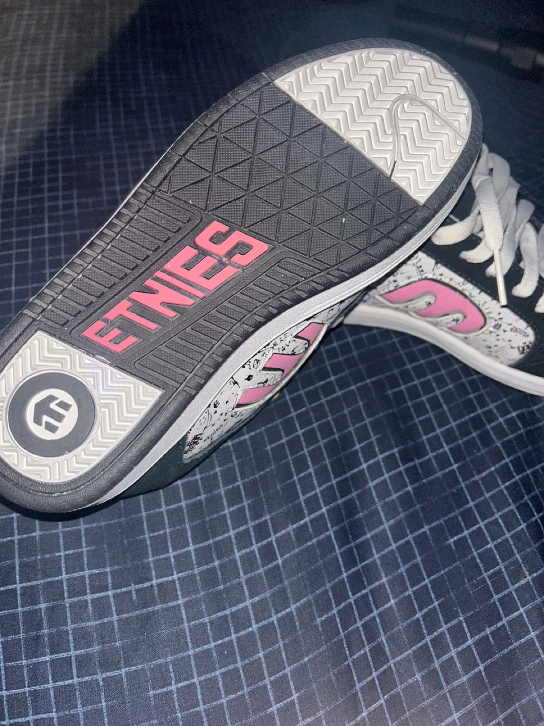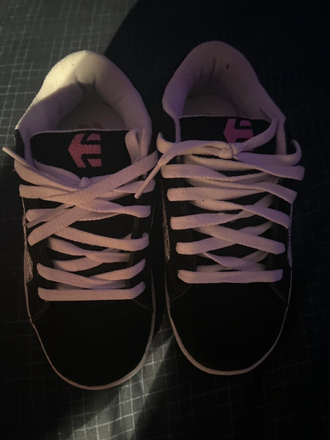 108Black suede ETNIES skate shoes. Pink and white accents. White laces. NEW NEVER WORN SIZE 4 BACK TOO SCHOOL NEED SHOES AT A GOOD PRICE