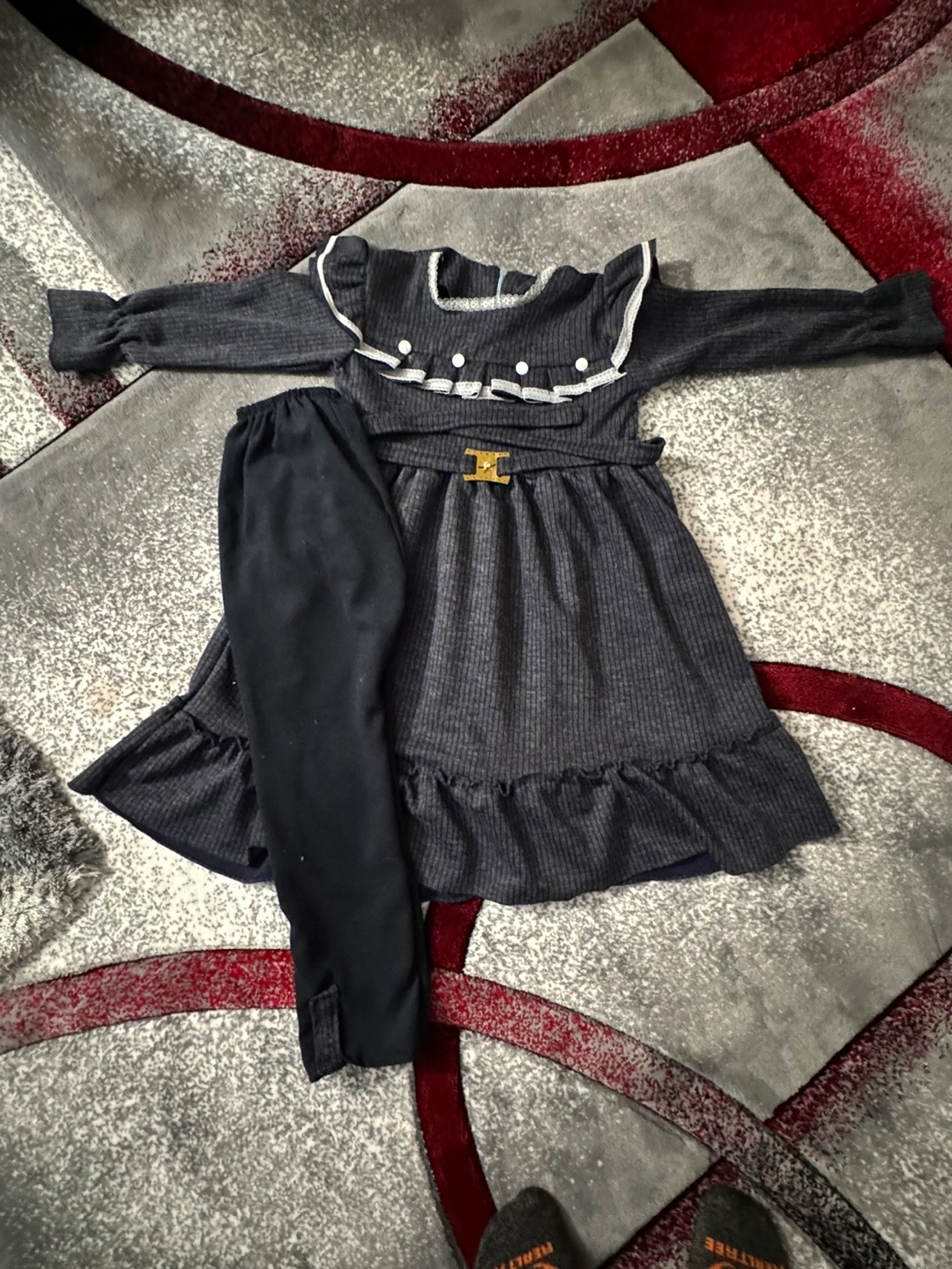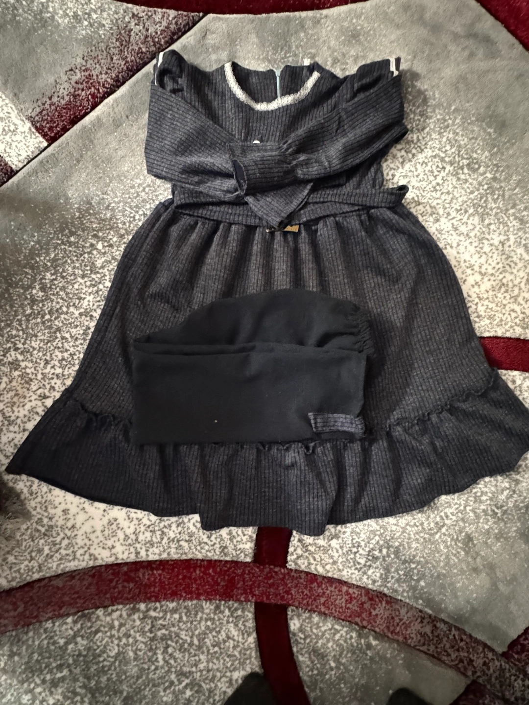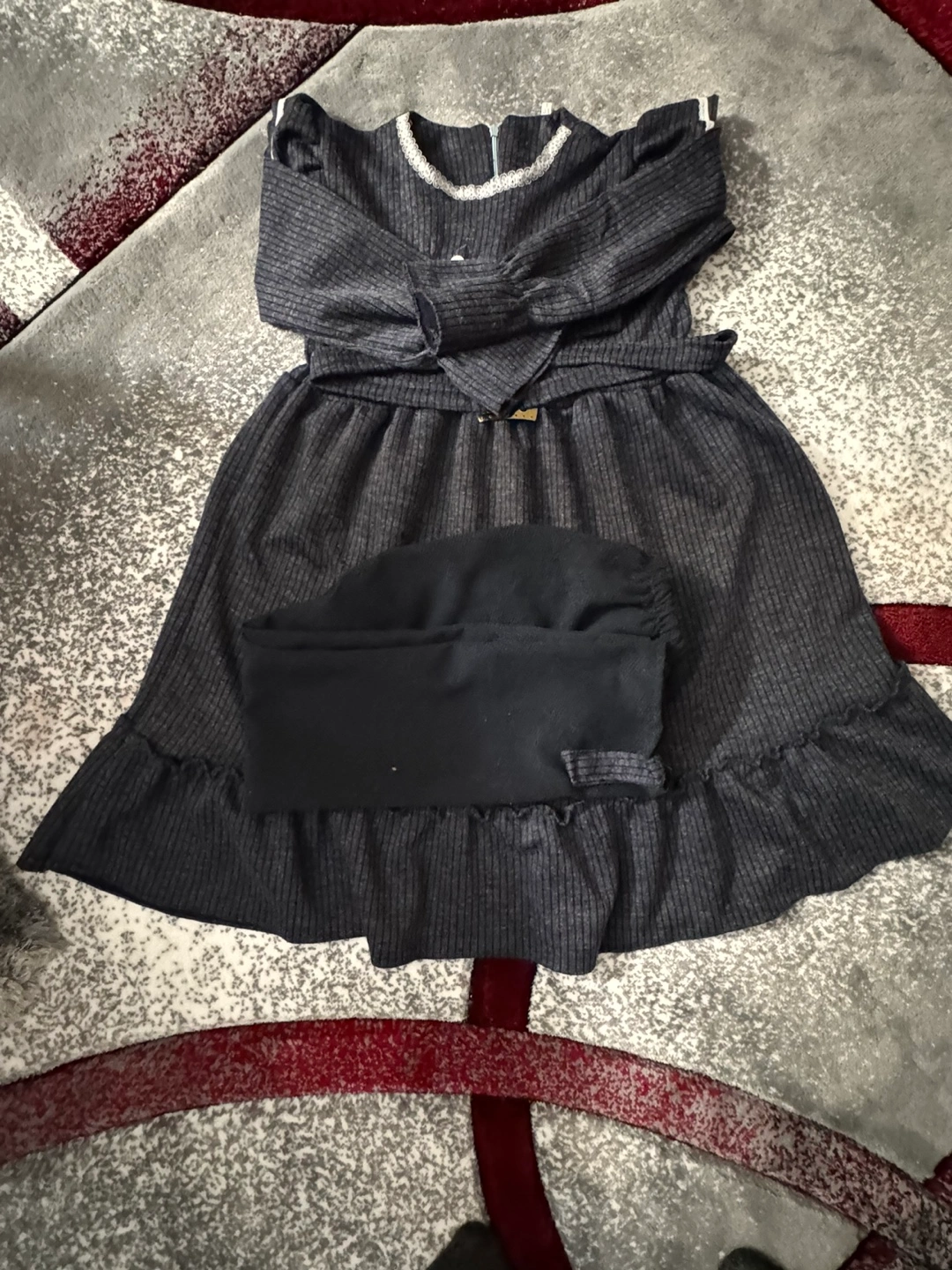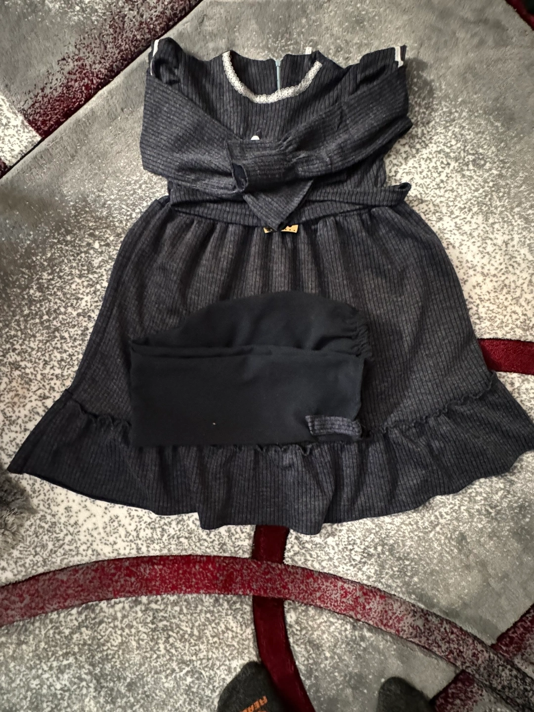 Adorable girls' outfit. Features a grey ribbed knit dress with ruffle detailing and a matching pair of black leggings. Long sleeves, a defined waistline, and a comfortable fit. Perfect for casual wear.