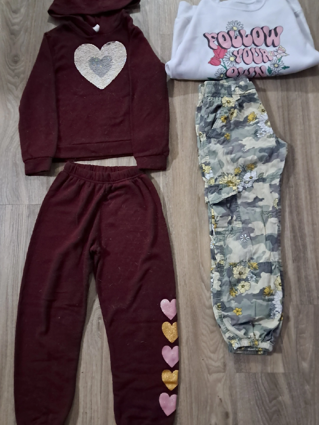 10Selling a cute set of girls' clothing! Includes a burgundy hoodie with a heart design, matching sweatpants with heart details on the leg, and a pair of floral camo cargo pants. Perfect for mixing and matching!