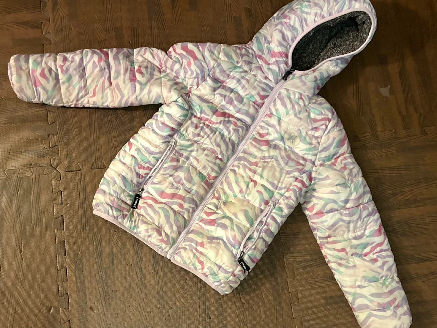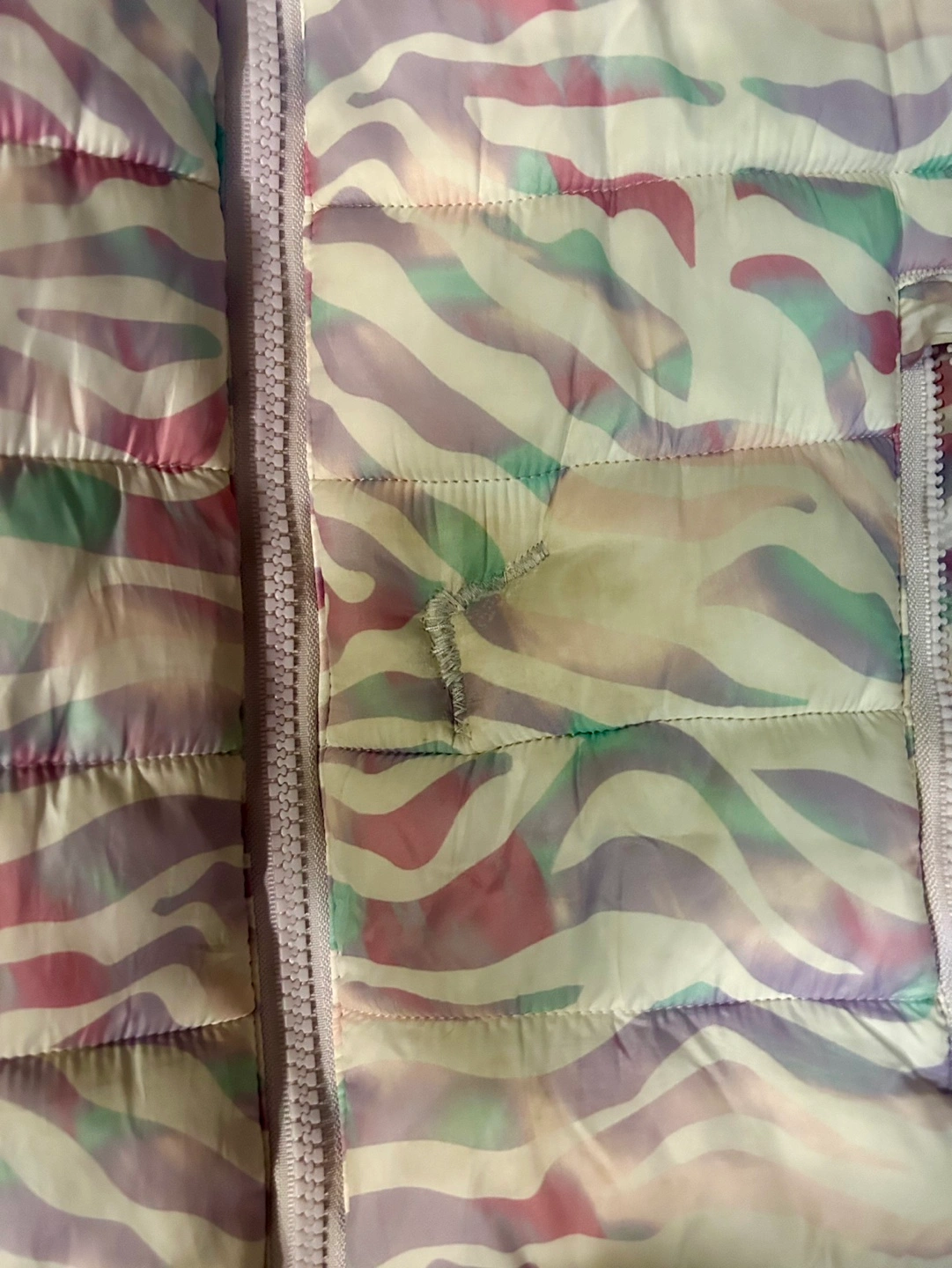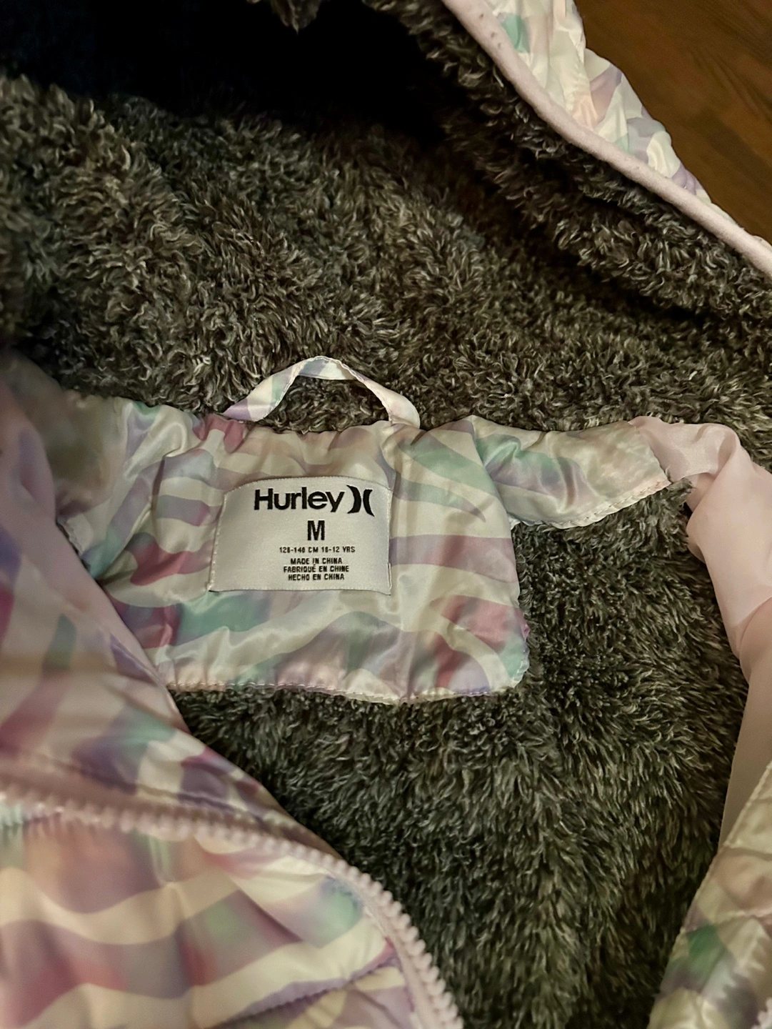 35Girls' Hurley puffer jacket. Size medium, Features a hooded design with a sherpa lining. Pastel zebra print. Small tear on the side which has been stitched . Zipper closure. Two pockets.