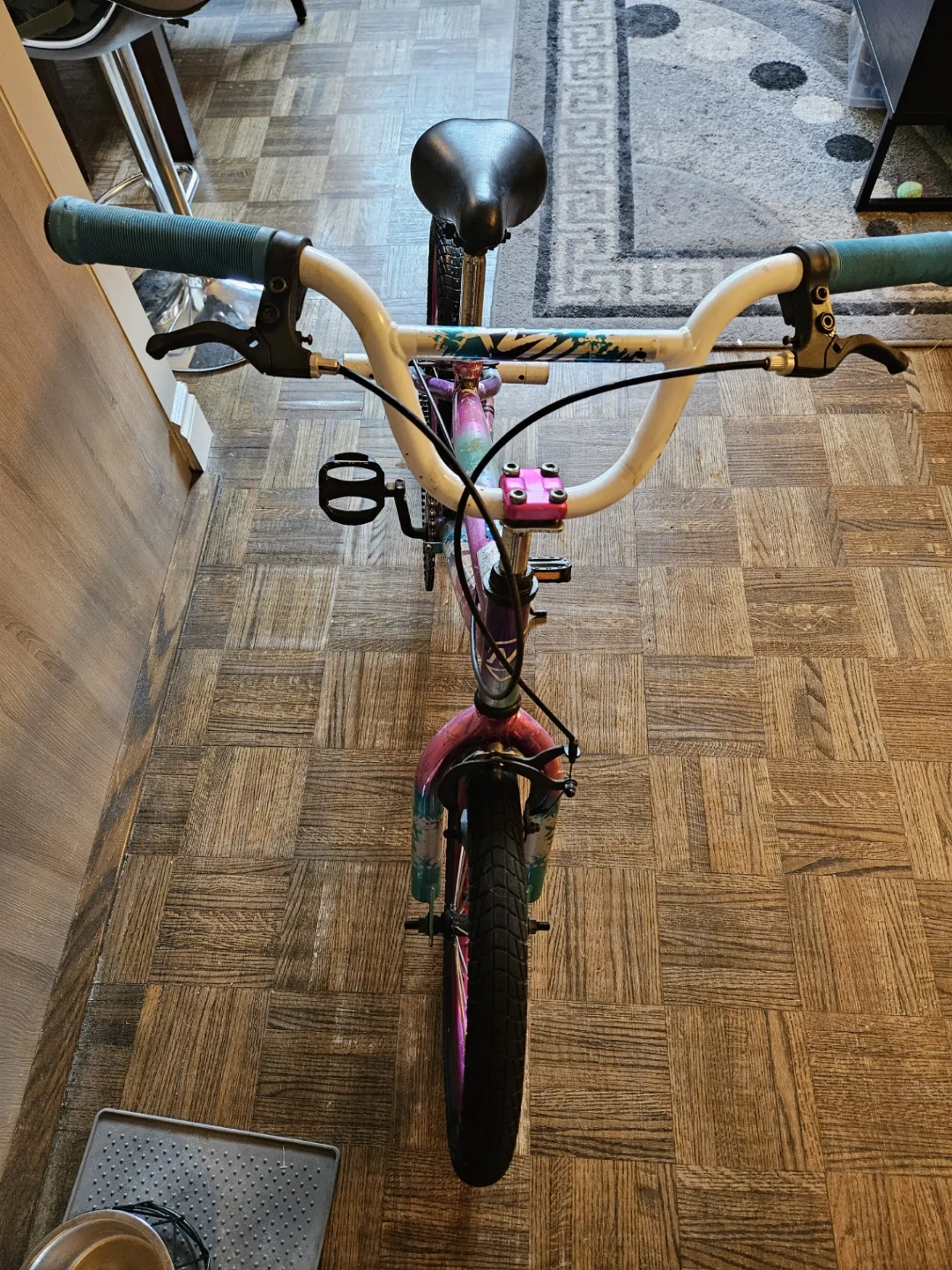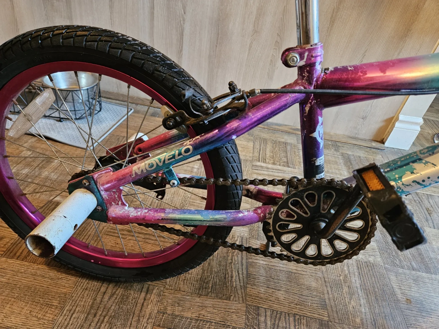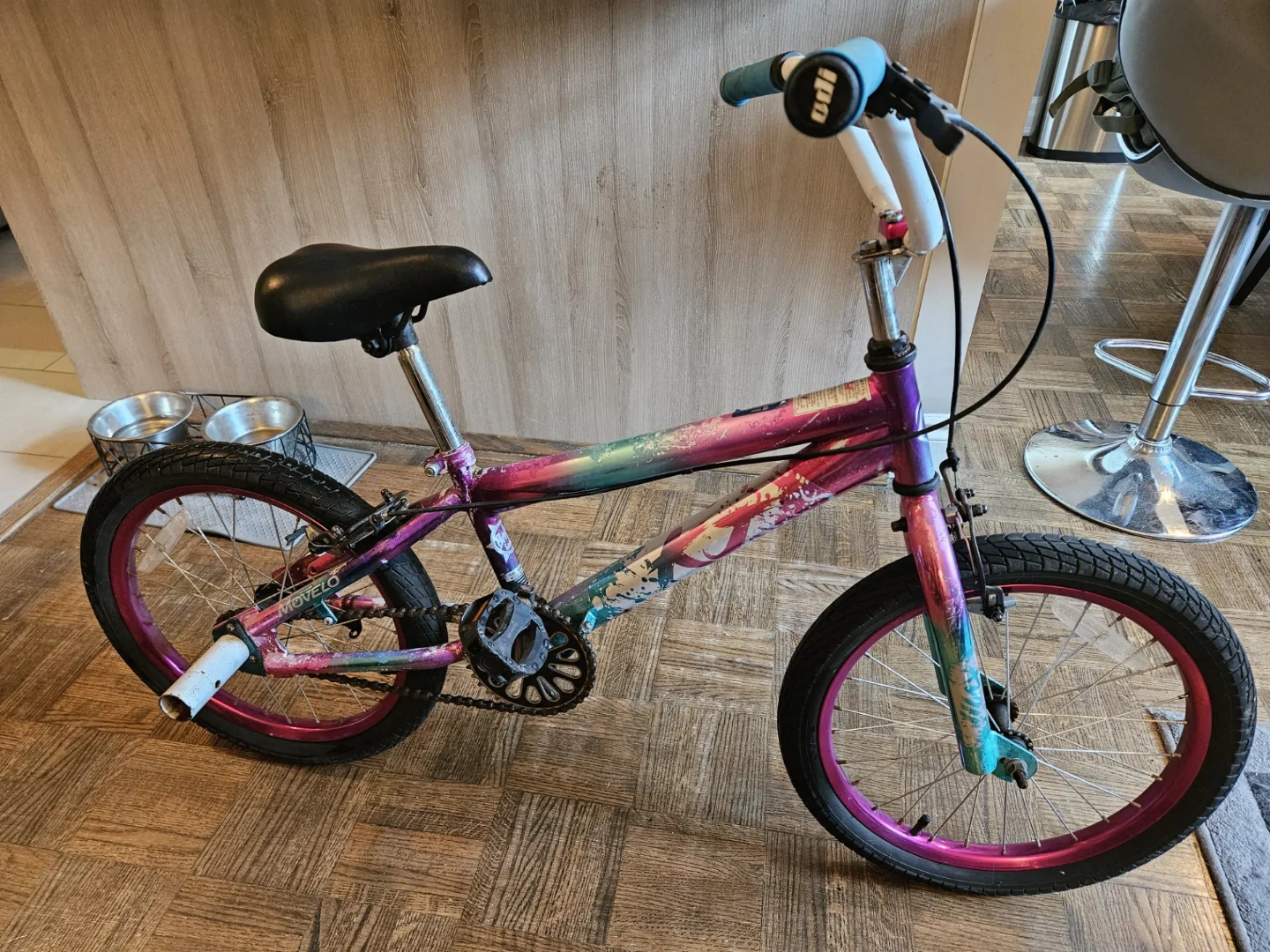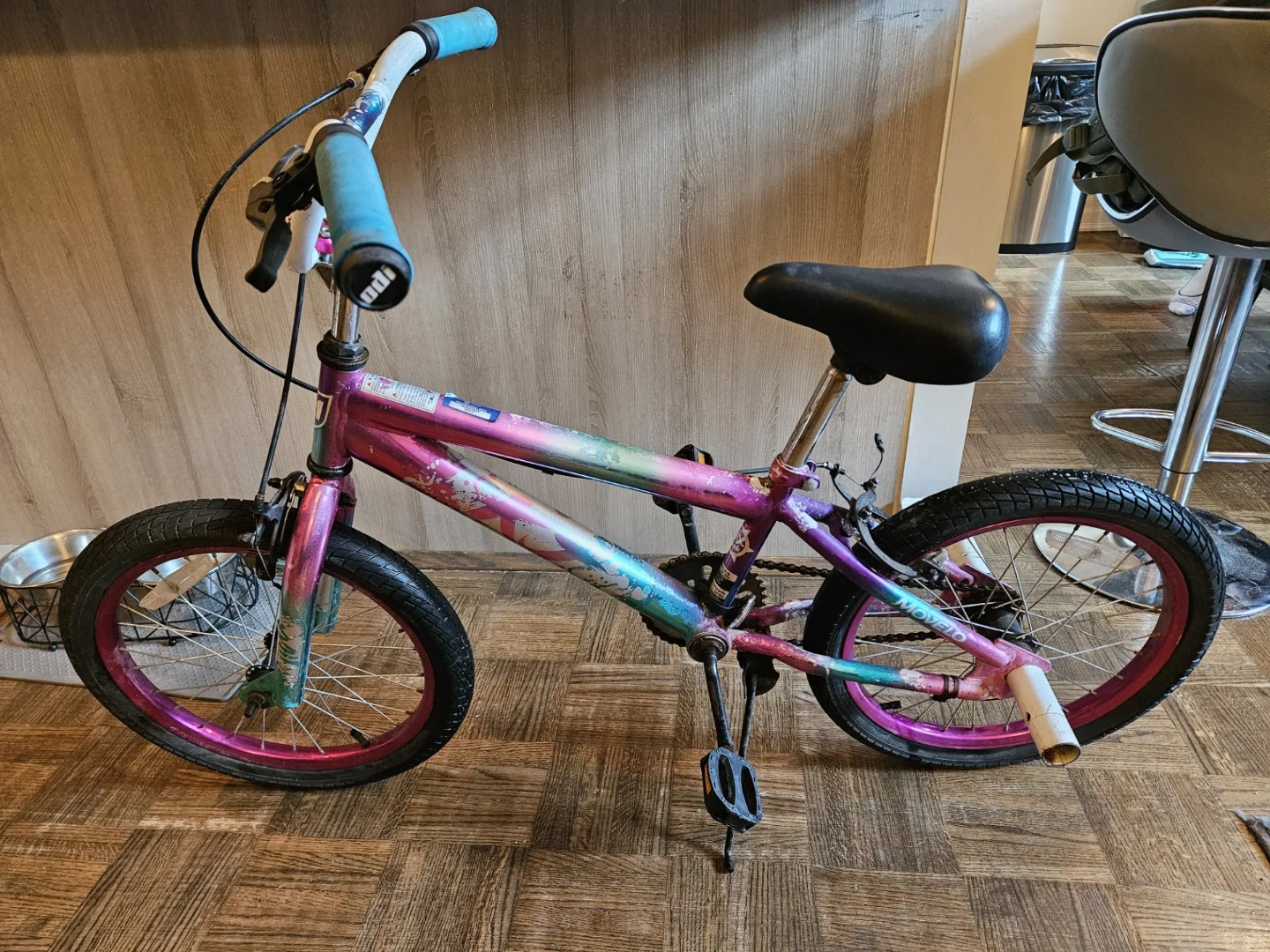 Used girls' bicycle. Purple, pink and teal colour scheme. Great bike for a 6 to 11 year old.