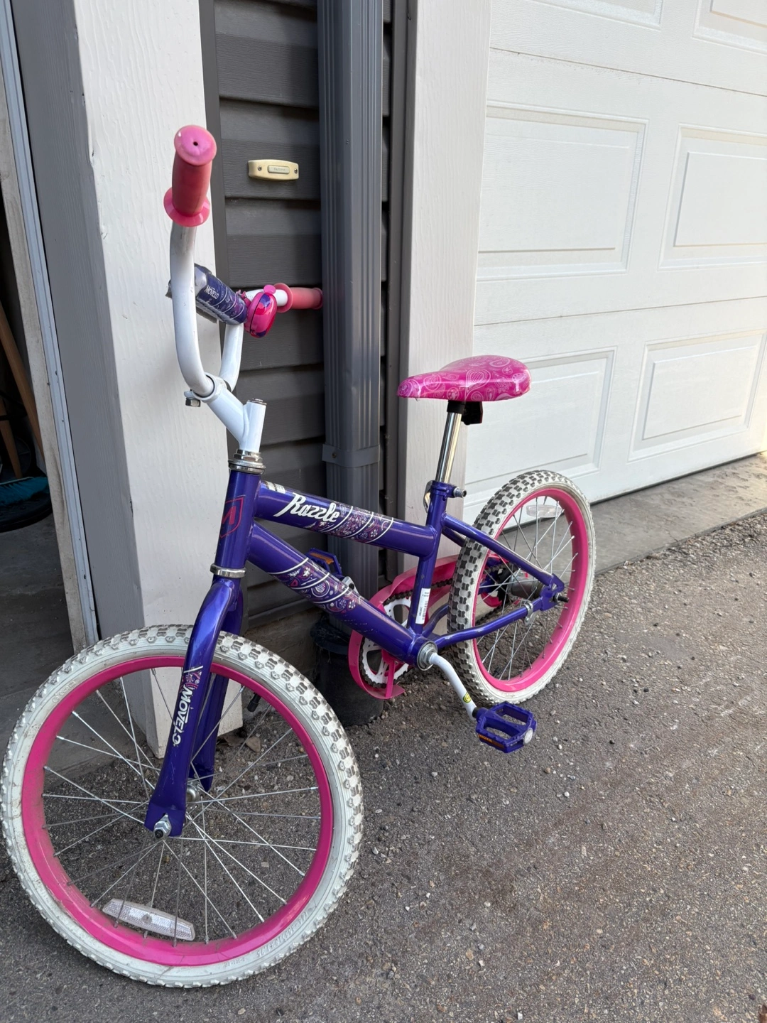Girls' bicycle, purple frame with pink accents. Features white-walled tires. Good used condition.