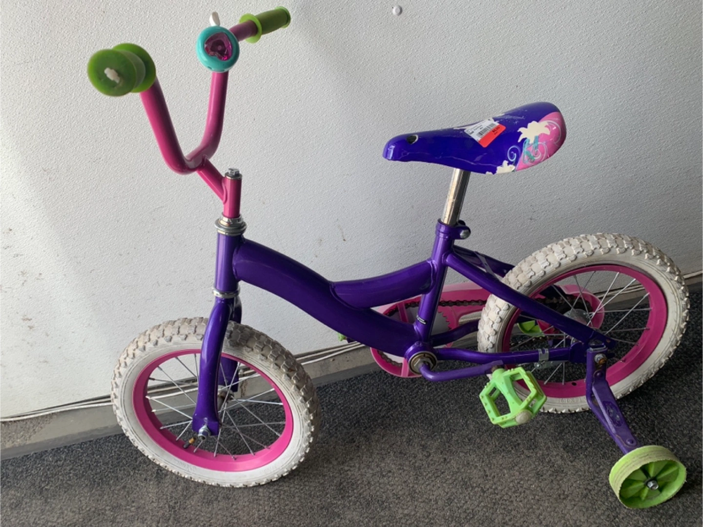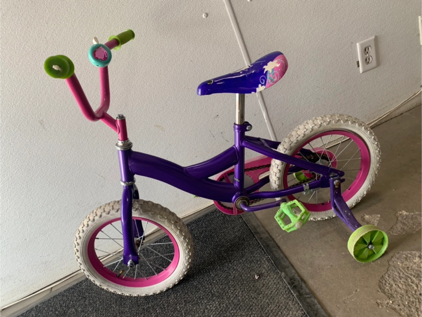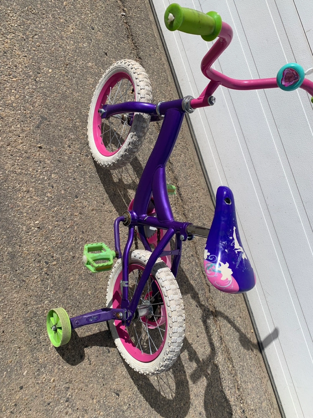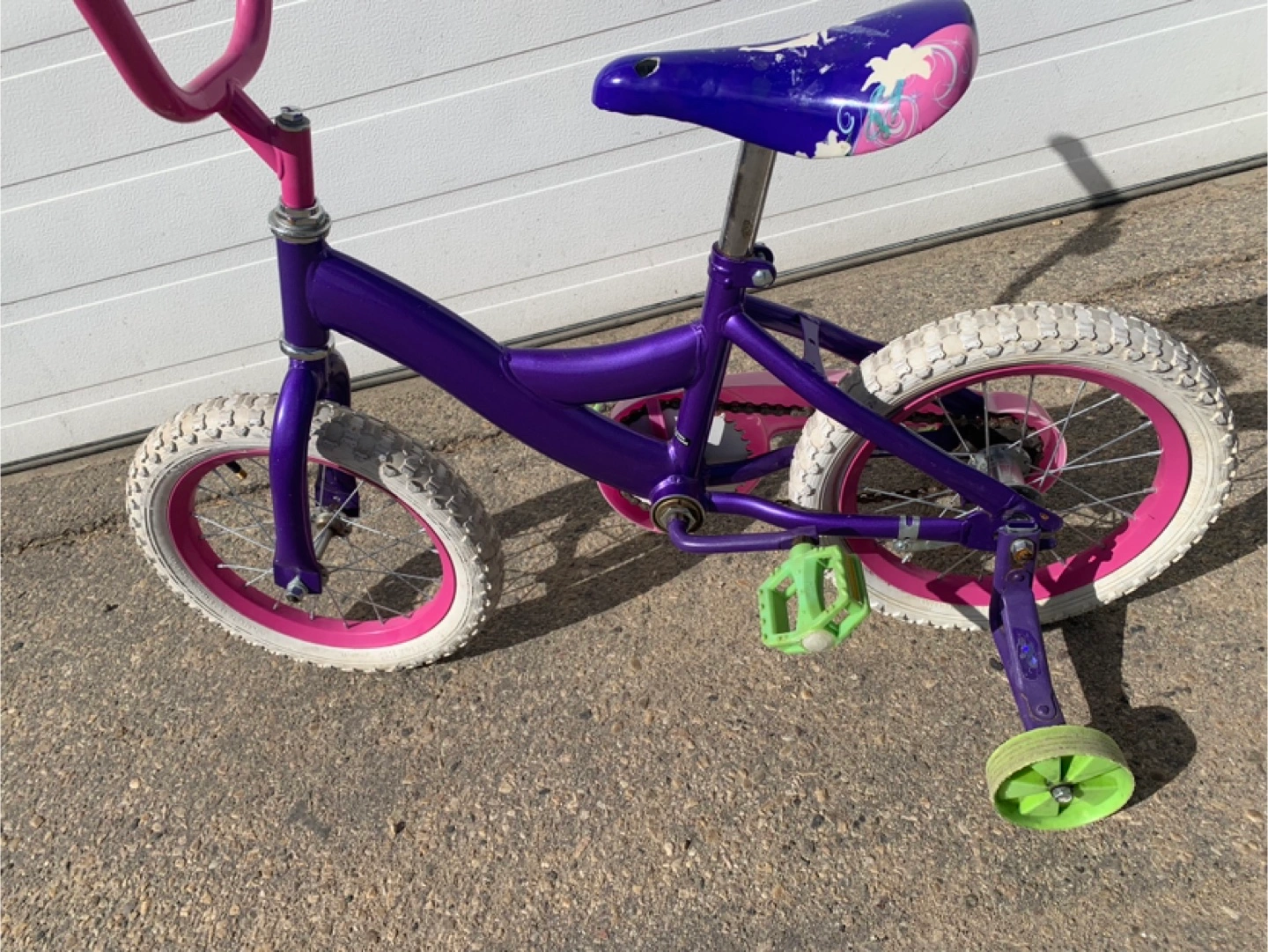 Pre-owned toddler bicycle. Purple frame, pink accents. Features training wheels. Suitable for young children. Shows some wear.