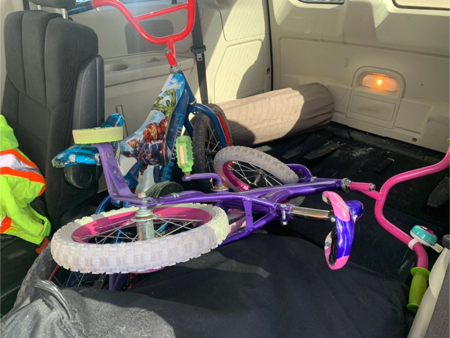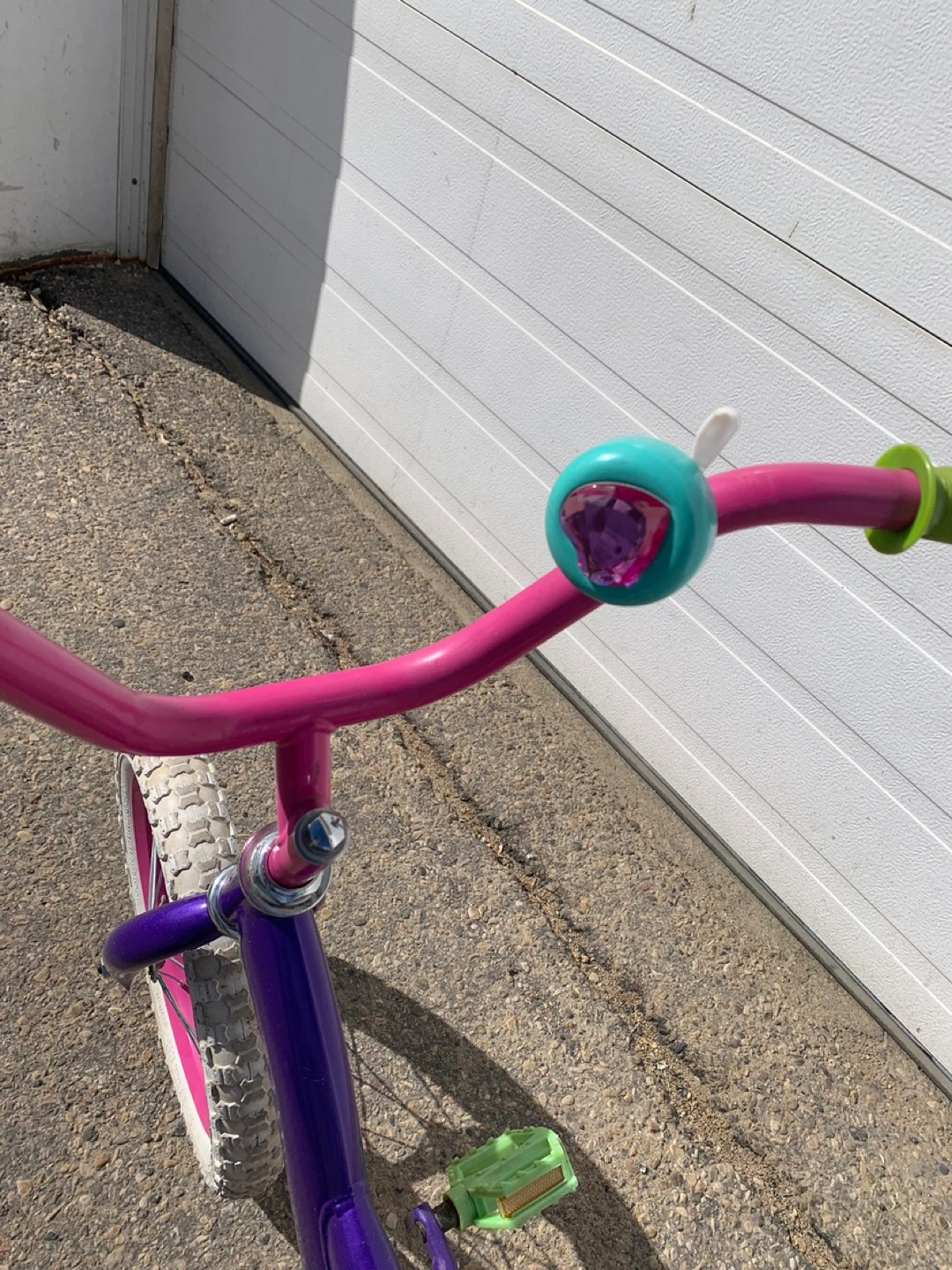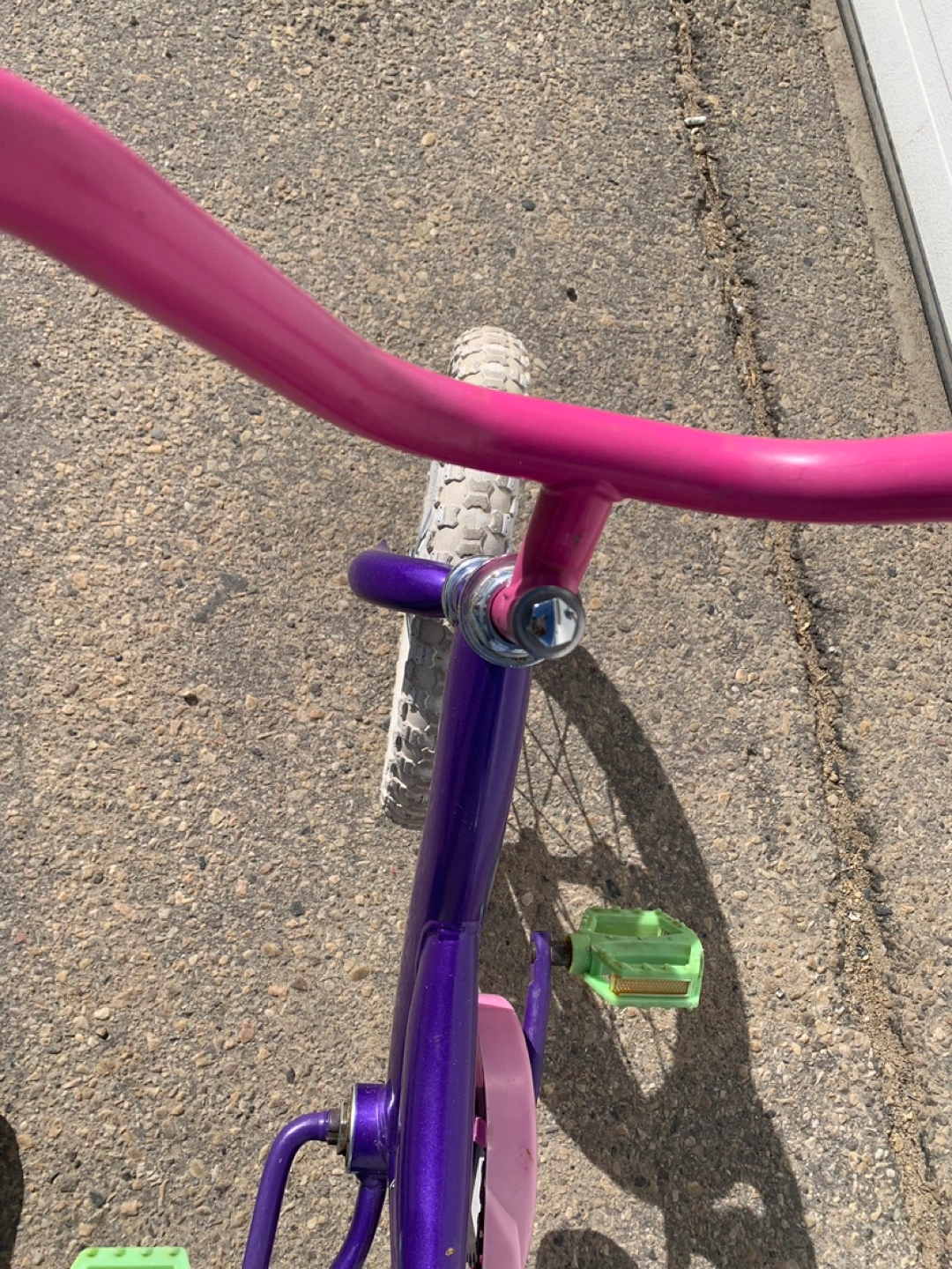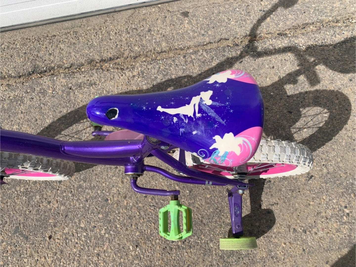 Pre-owned toddler bicycle. Purple frame, pink accents. Features training wheels. Suitable for young children. Shows some wear.