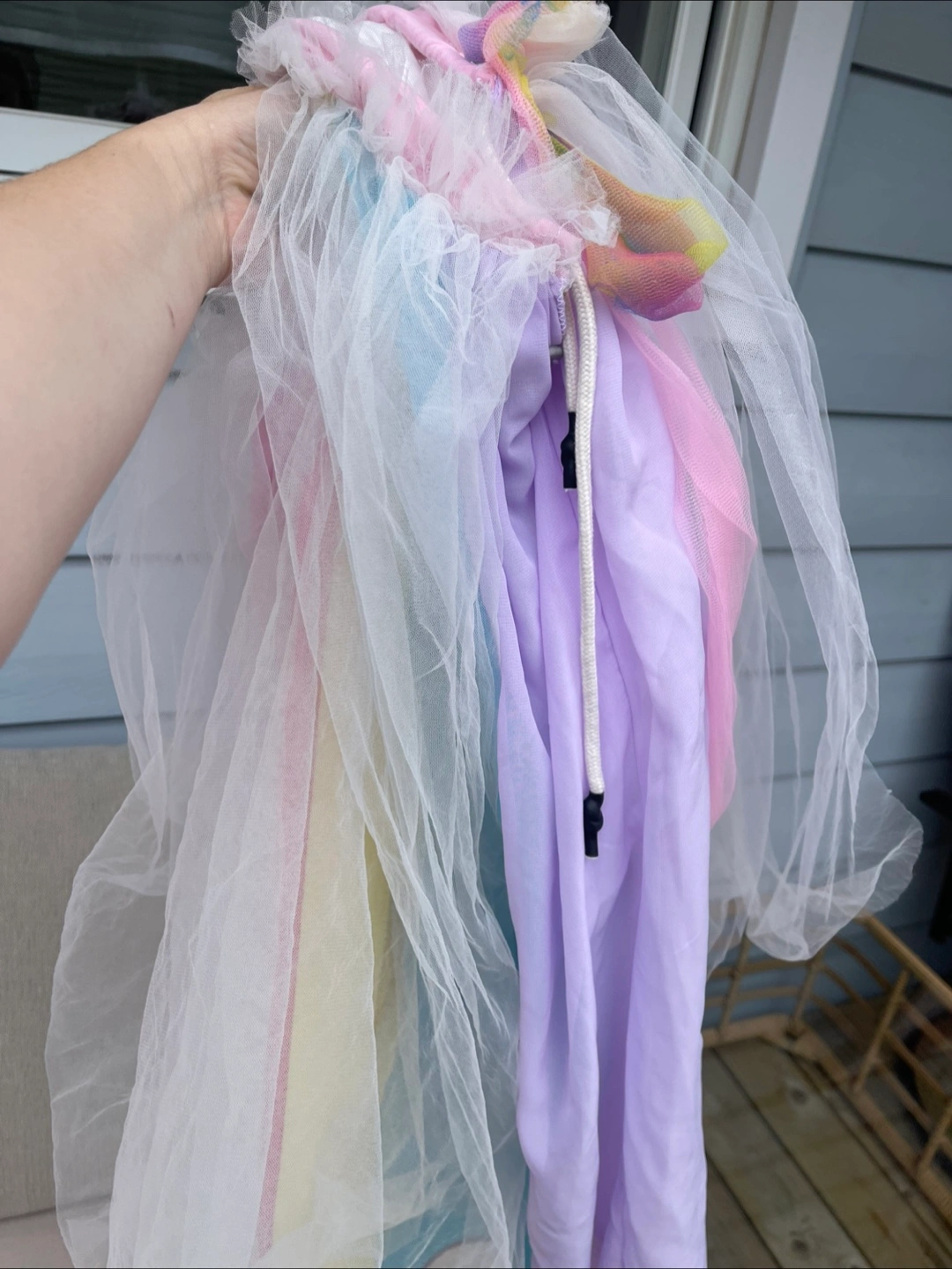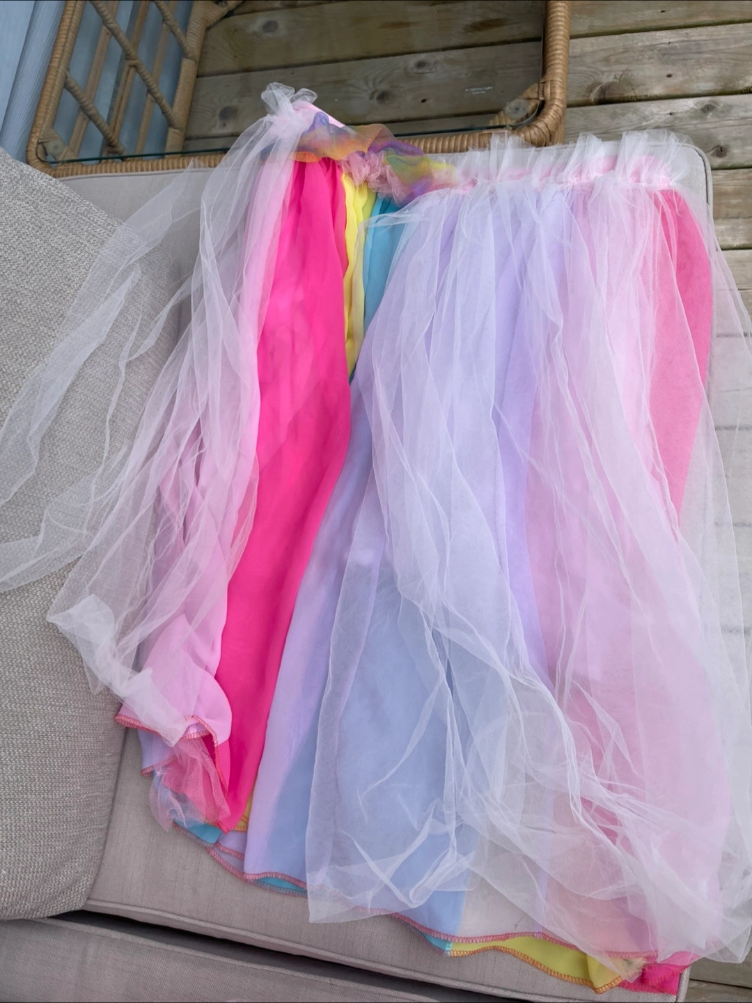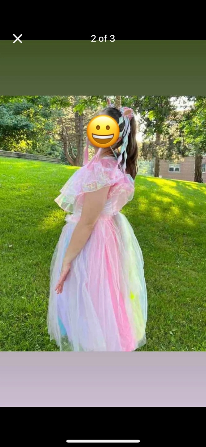 A beautiful rainbow tulle dress for girls. Perfect for dress-up or parties! It's in great condition and ready for a new home. Skirt, additional skirt overlay, bodysuit and headband. No hair Adult Size M-L