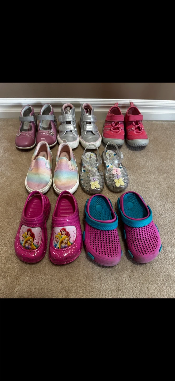 Selling a bundle of girls' shoes, perfect for your little one! Includes a variety of styles, including slip-ons, sneakers, and sandals. Size is 8. Great for everyday wear and playtime! $30 for all 7 pairs. They are all practical New. Except the pink and blue Croc style pair. PICKUP in Cranston SE. No Delivery