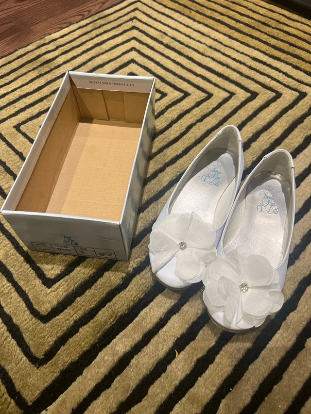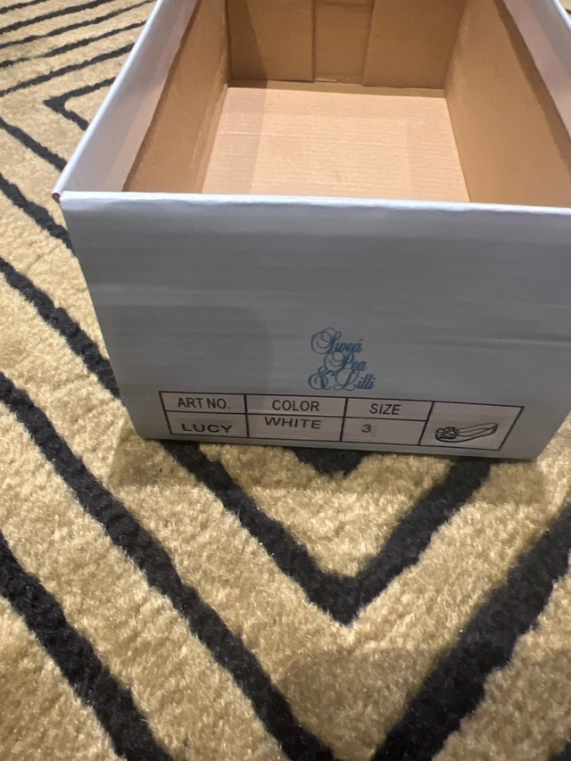 White leather girls' flats. Size 3. Floral accents. Comes in original box. Worn once. Not needed anymore. perfect for a special occasion or dressing up any outfit! These adorable flats feature a sweet floral embellishment on the toe. They are in good condition and ready for a new little owner to enjoy. The brand is Sweet Pea Lilli. These would be perfect for a flower girl! Available with the box!