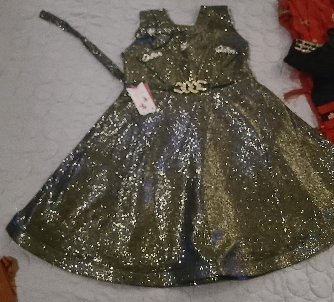 75Here's a cute dress for girls! It has a sparkly design and comes with a belt. Perfect for parties or special occasions