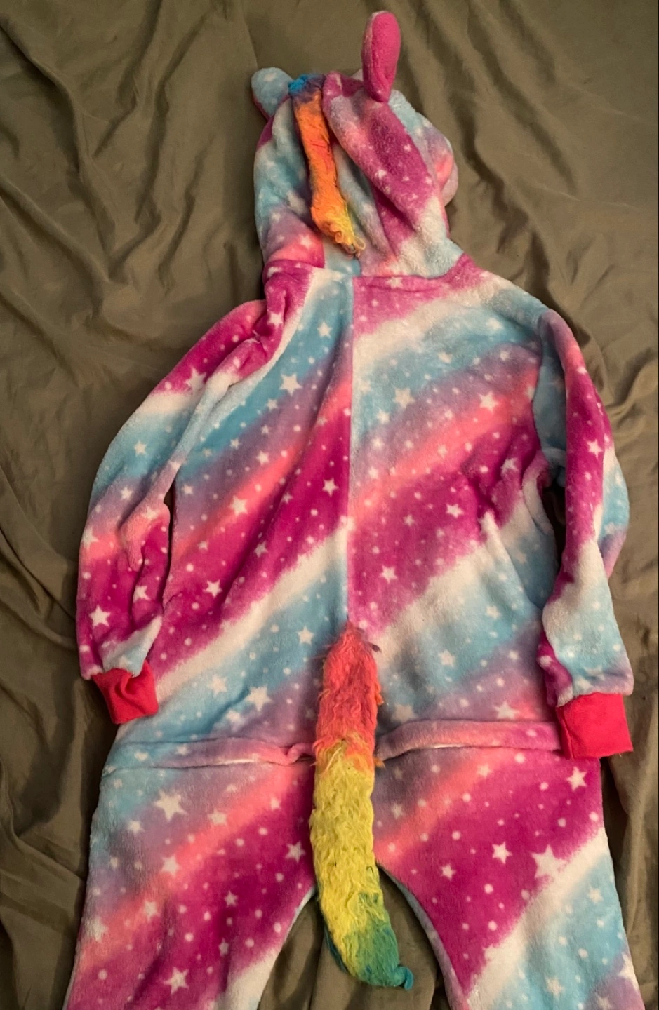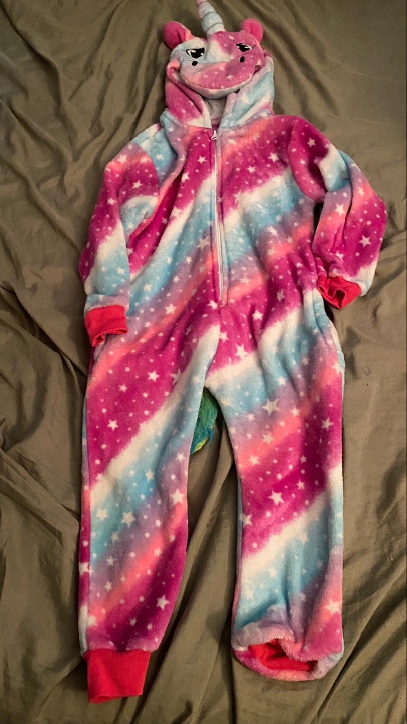 30Rainbow unicorn pajamas. Soft and cozy fleece. Features a hood with unicorn ears and a rainbow tail. Zip closure. No delivery No holds As is no refunds