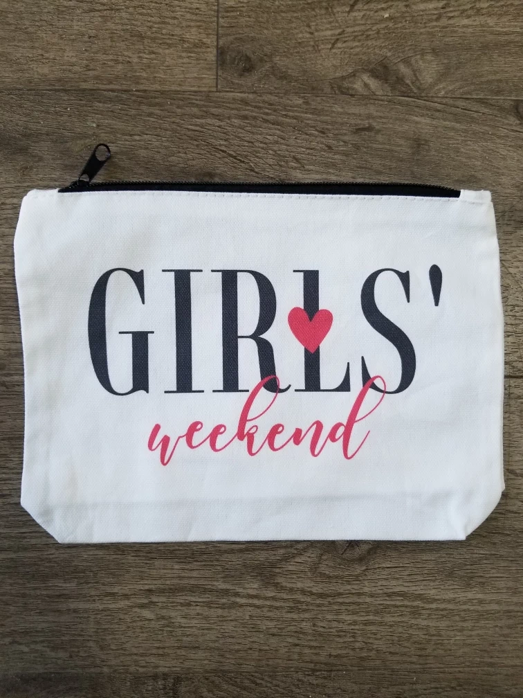 240Cute cosmetic bag for a girls' weekend getaway! It's white with a black zipper and the words "GIRLS' weekend" printed on the front. Perfect for travel or everyday use to keep your makeup and toiletries organized. Brand new