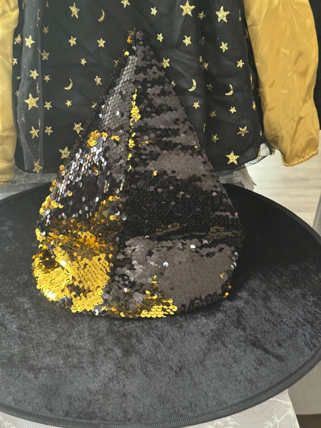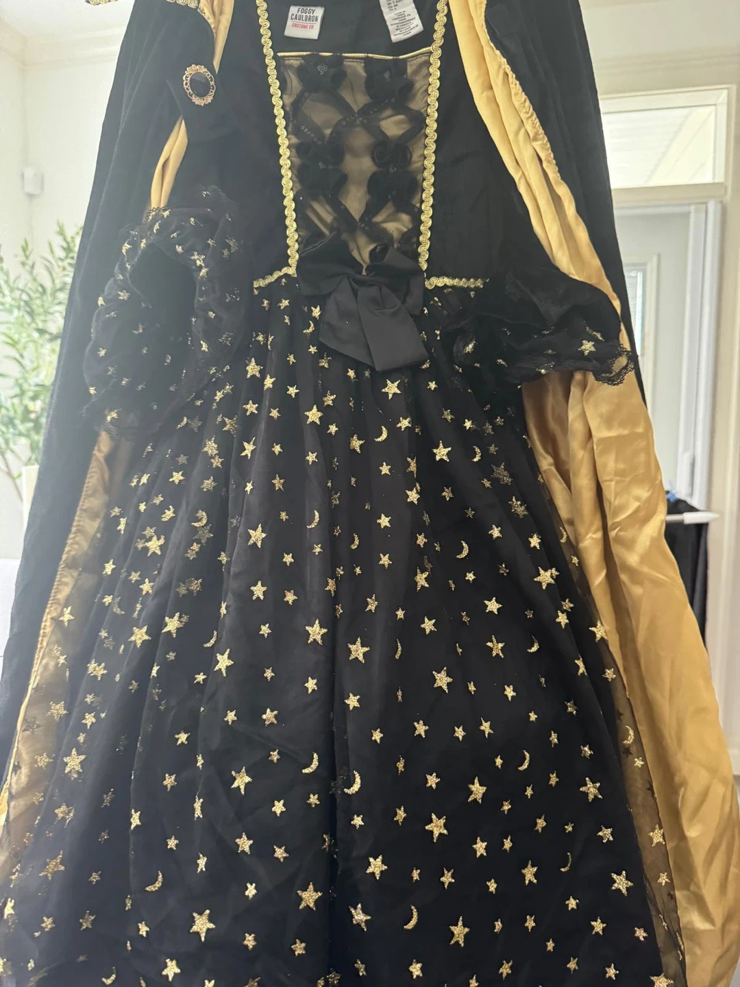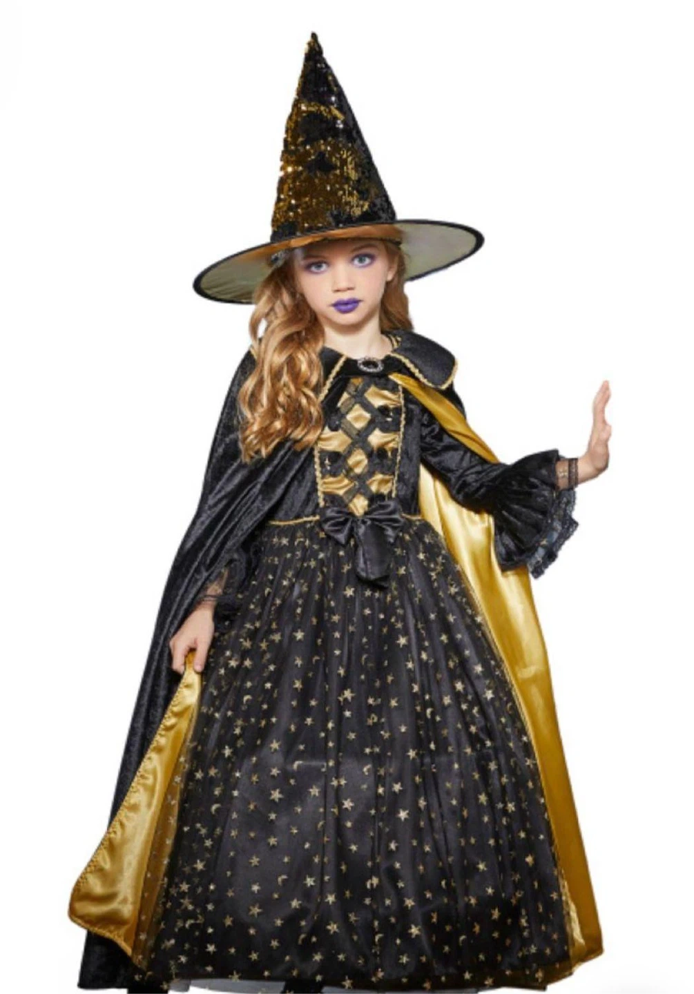 Selling a complete witch costume for girls! It includes a dress with star and moon details, a cape with gold lining, and a matching witch hat. Perfect for Halloween or dress-up play!