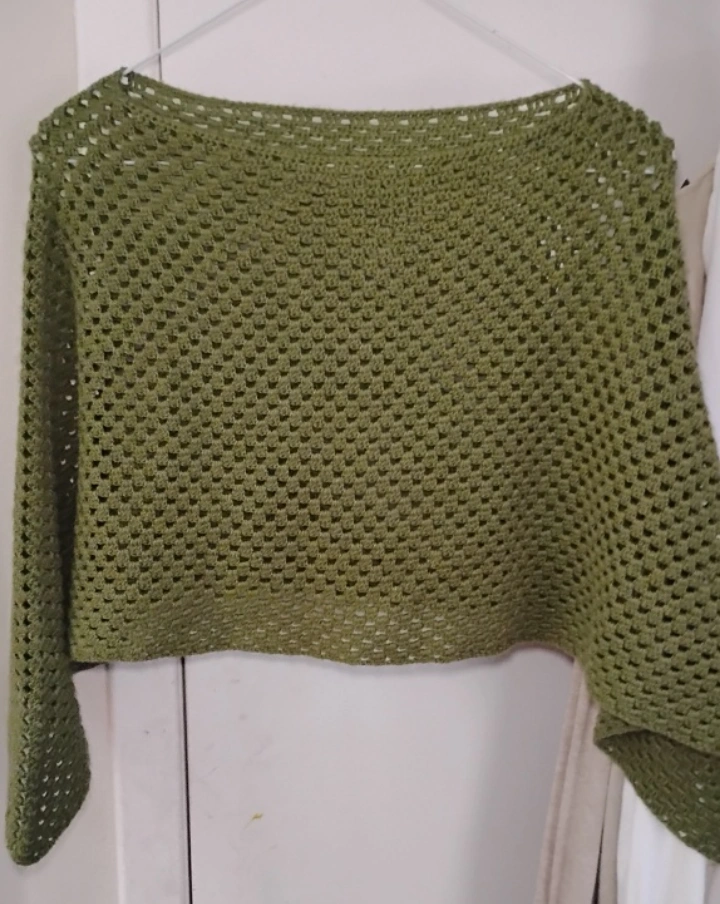 25Unique crocheted poncho. Olive green colour. Relaxed fit. Open neckline. Lightweight and breathable. Perfect for layering. girls xl. Excellent Quality and like new!