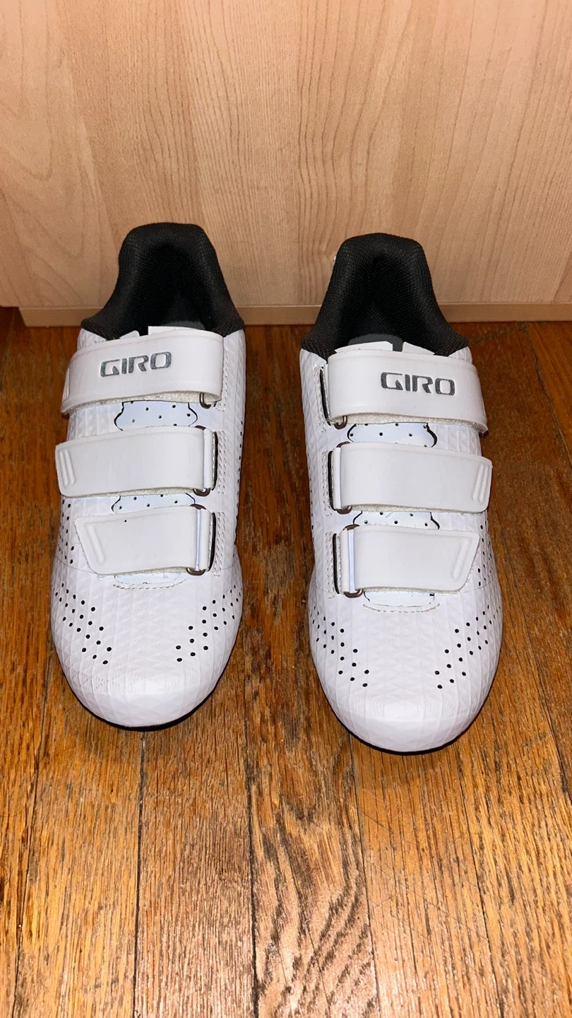 Selling a pair of Giro cycling shoes in size 39 (US 7.5). They are white with black detailing and in good condition. Perfect for your next ride!