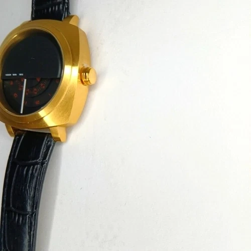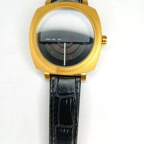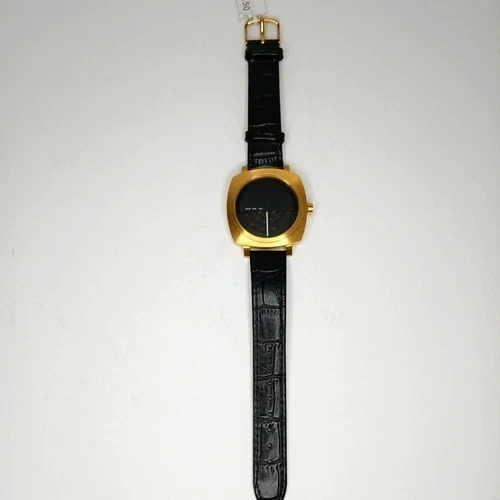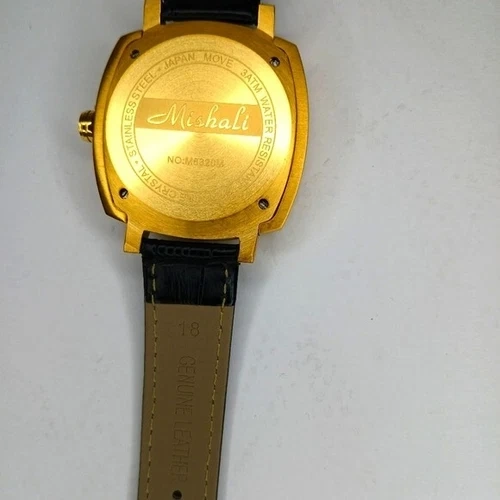 This is a black and gold Mishali Tech Watch. It features a genuine leather band, is water-resistant, and has a stainless steel case. Feel free to message if you have any questions!