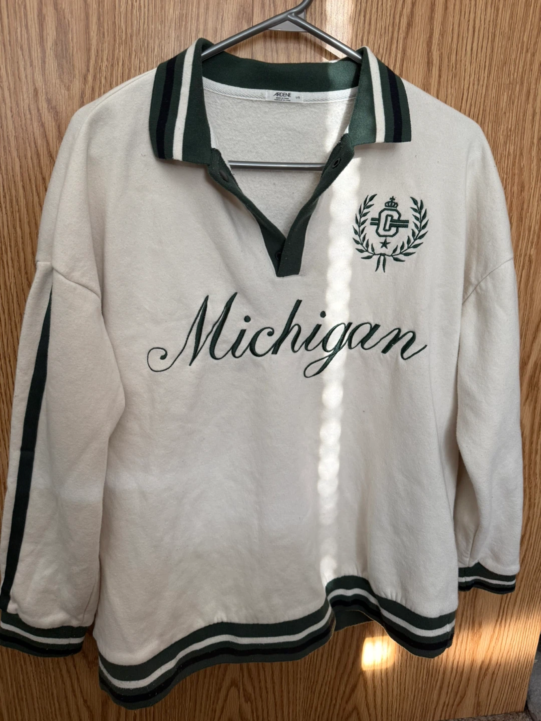 Cozy Ardene pullover with a Michigan design! This cream-coloured, long-sleeved top features a green collar and striping. It's a size large and in great condition. Perfect for showing off your Michigan pride or just staying comfy.