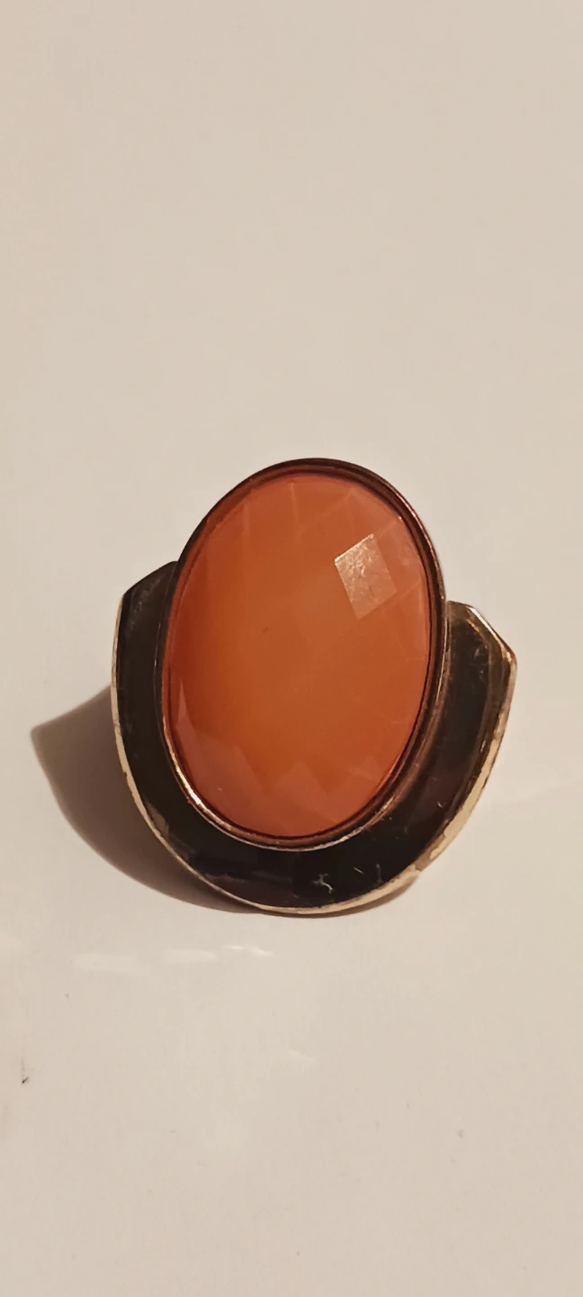 Ring with a large, faceted orange stone set in a gold-tone metal band. The band has a unique, modern design. It's a statement piece for any outfit! SIZE 8.