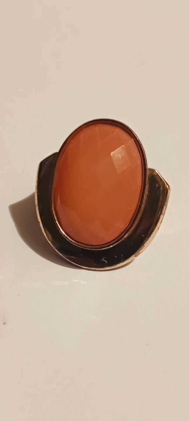 Ring with a large, faceted orange stone set in a gold-tone metal band. The band has a unique, modern design. It's a statement piece for any outfit! SIZE 8.