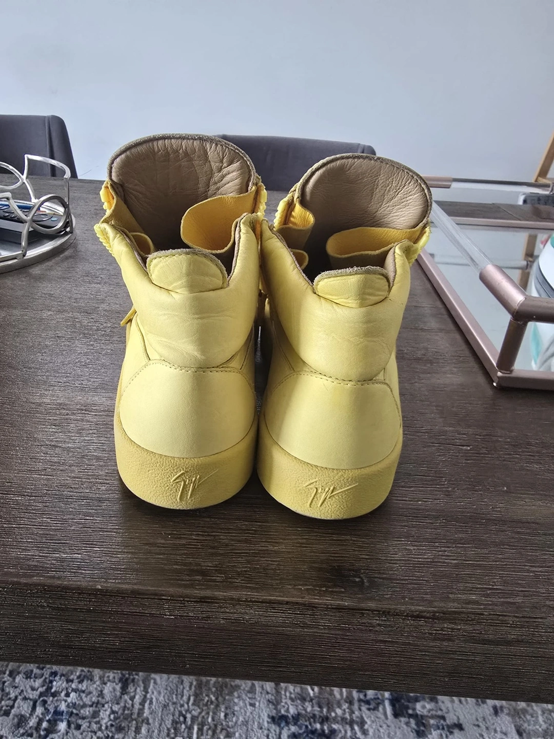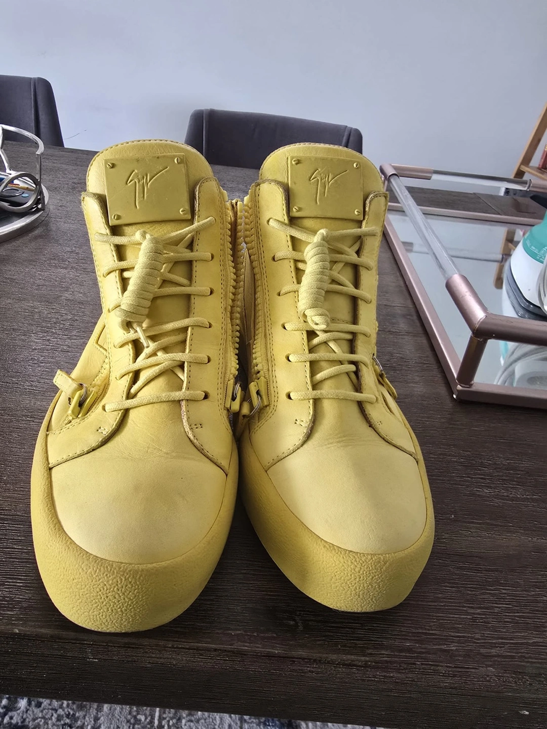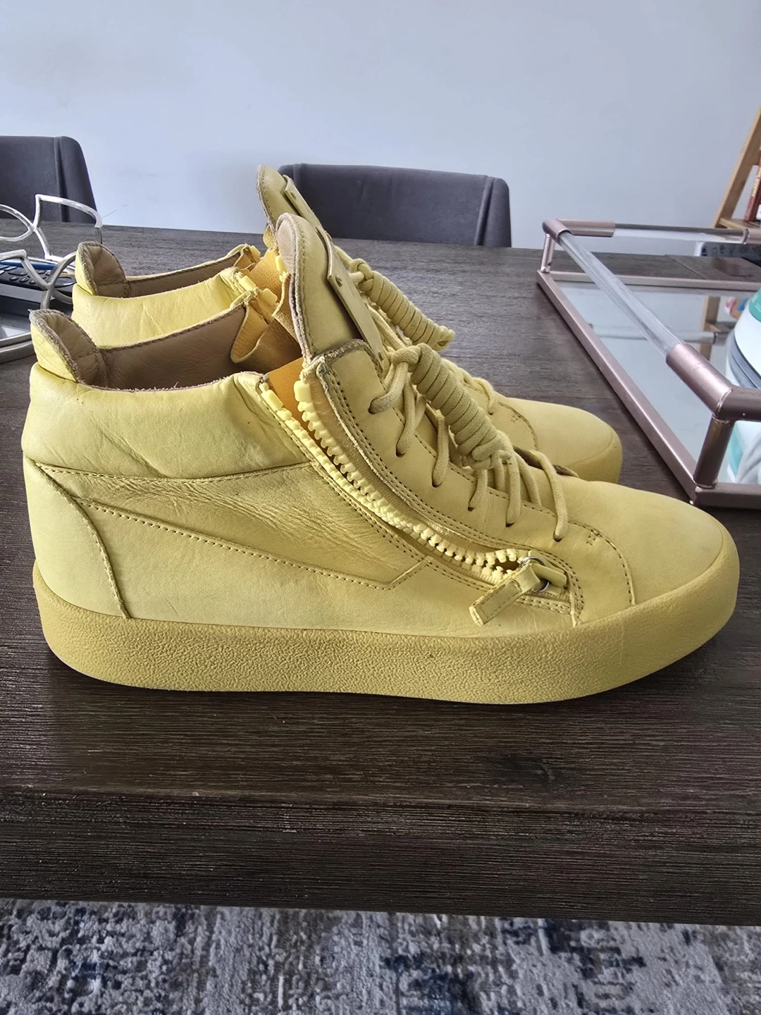 60Pre-owned Giuseppe Zanotti Design high-top sneakers. Bright yellow leather. Side zipper closure. Minimal wear. Size 43. Made in Italy.