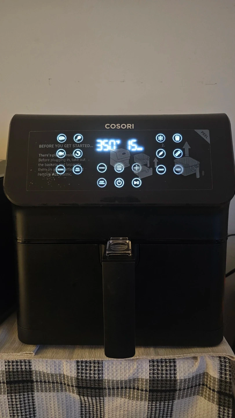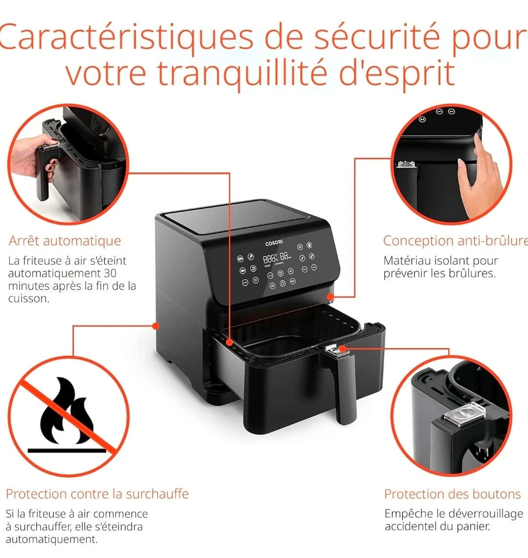 Cosori air fryer CP358-AF. It has dishwasher-safe baskets and a non-stick interior for easy cleanup. Features include automatic shut-off and overheat protection.