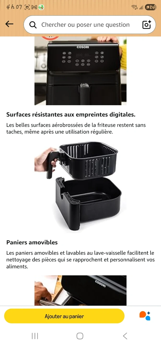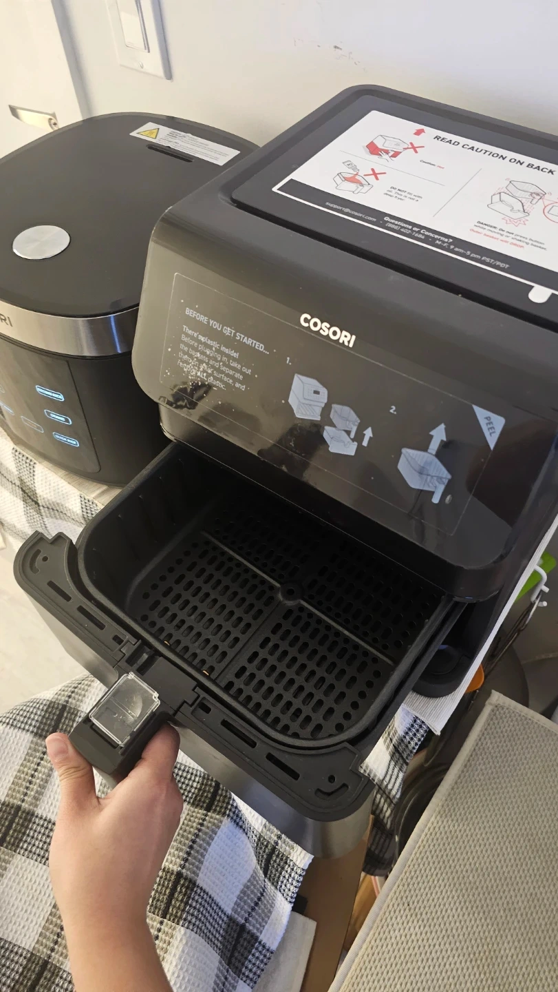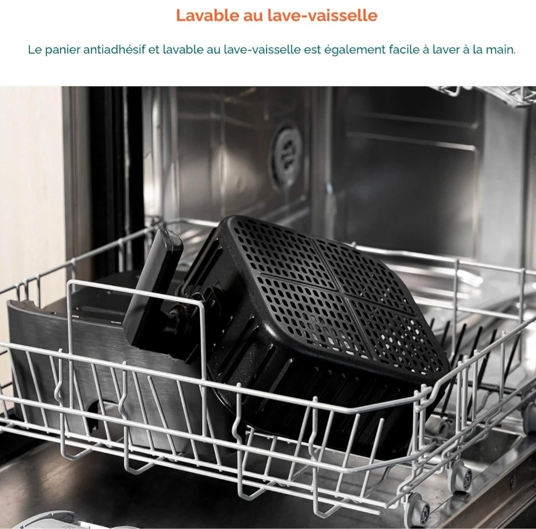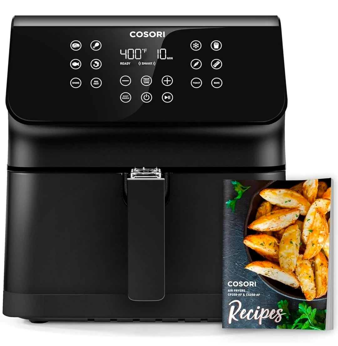 Cosori air fryer CP358-AF. It has dishwasher-safe baskets and a non-stick interior for easy cleanup. Features include automatic shut-off and overheat protection.