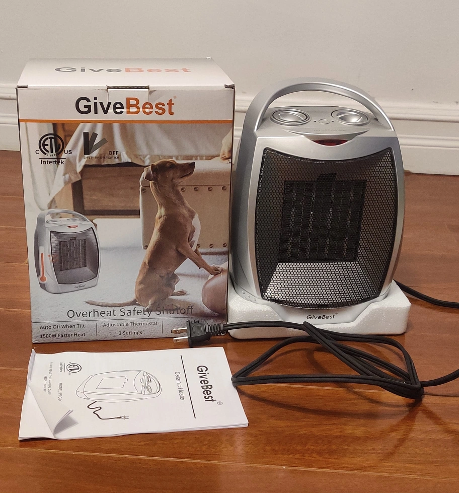 Portable ceramic heater. Auto-off when tilted. Adjustable thermostat. Three heat settings. 1500W. Includes power cord and instruction manua