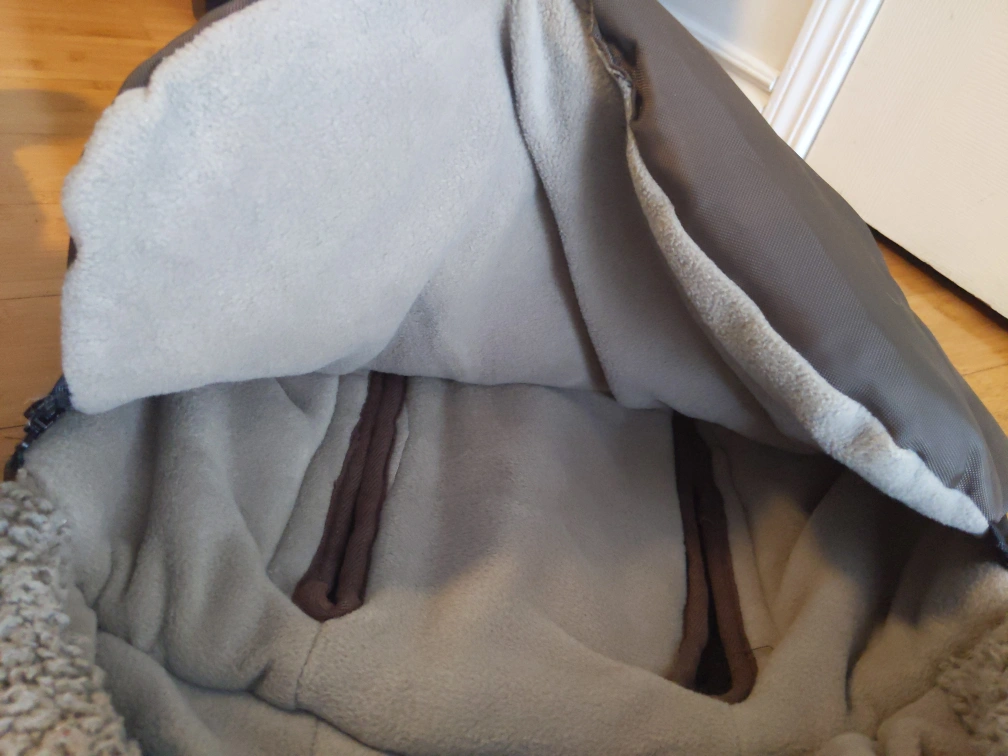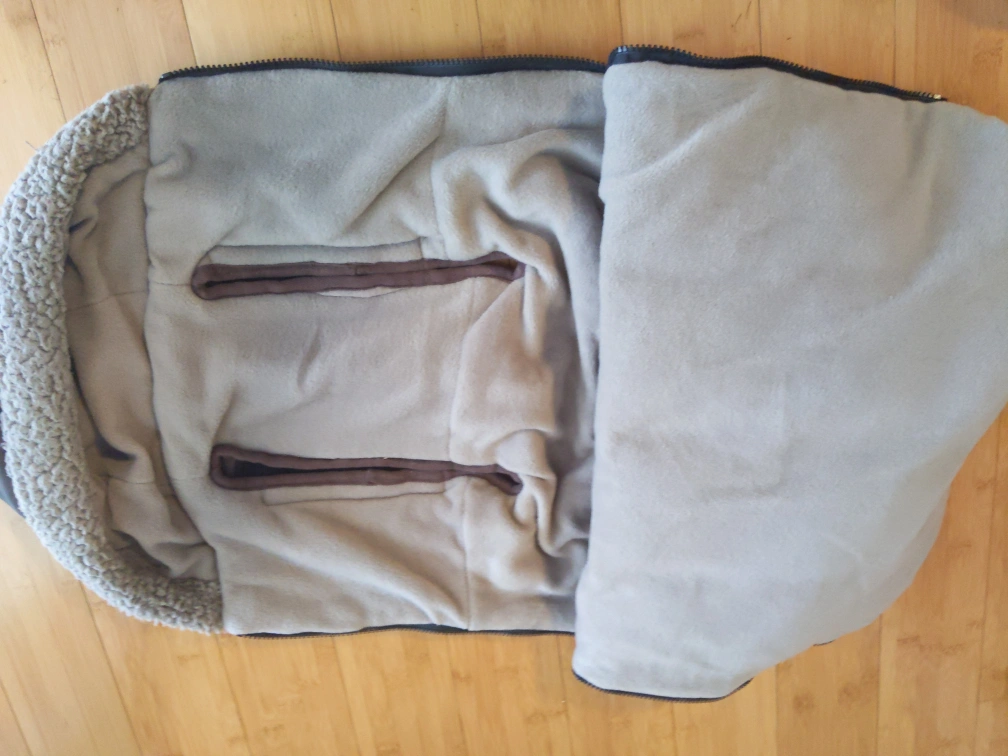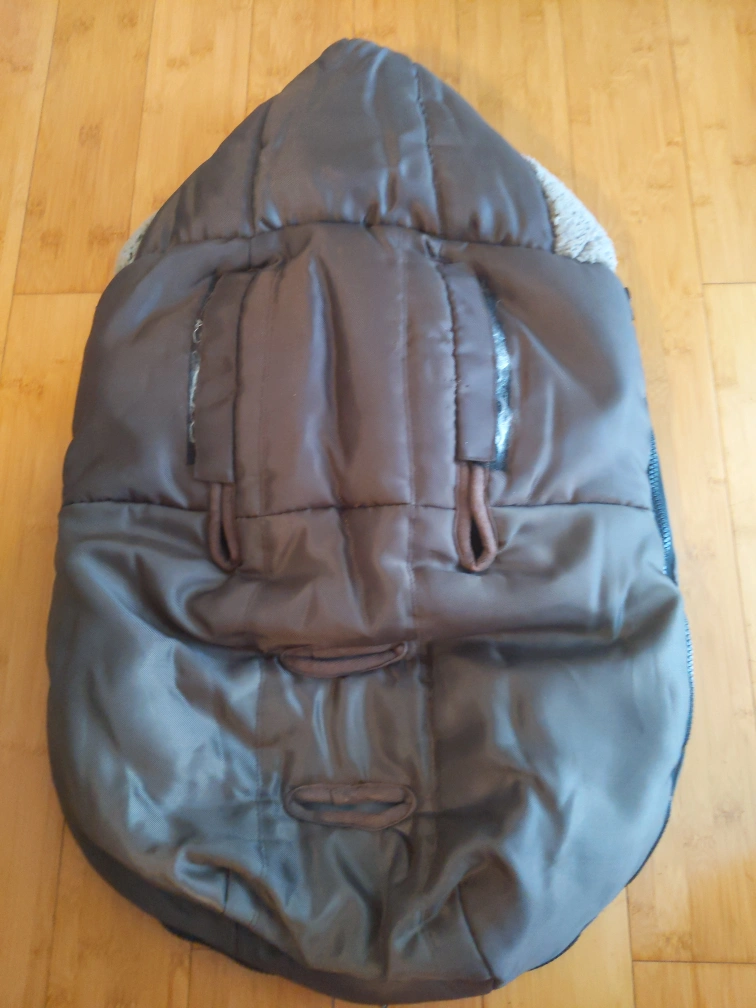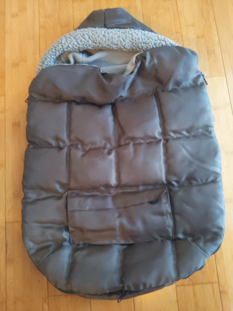 This cover is grey with a soft lining. It has a zipper and straps. It has a pocket on the outside. It is in great condition. It has zippers all over it which makes it easier to open. Very cozy and warm. Attachable to car seats as well. Payment is cash only.